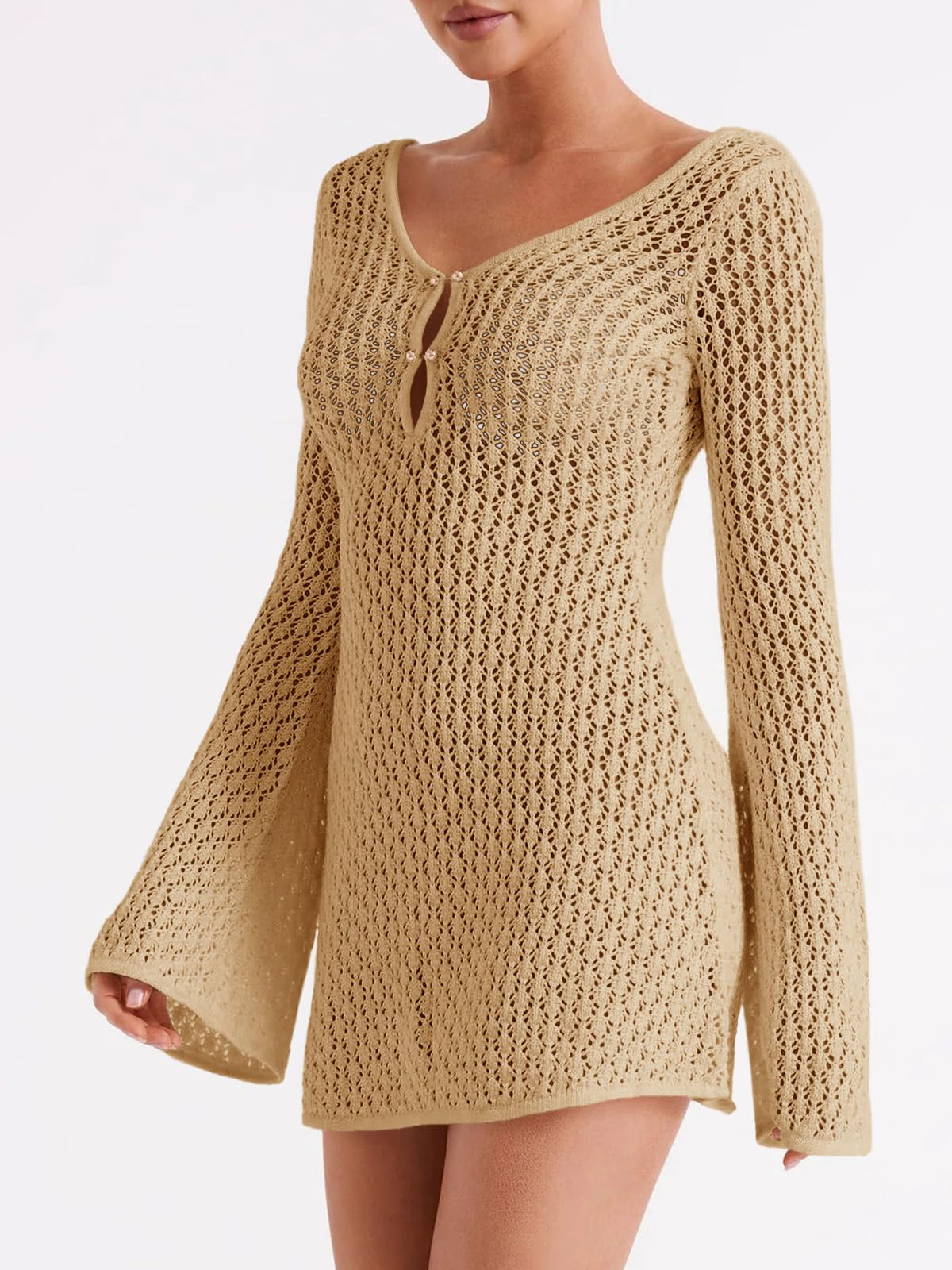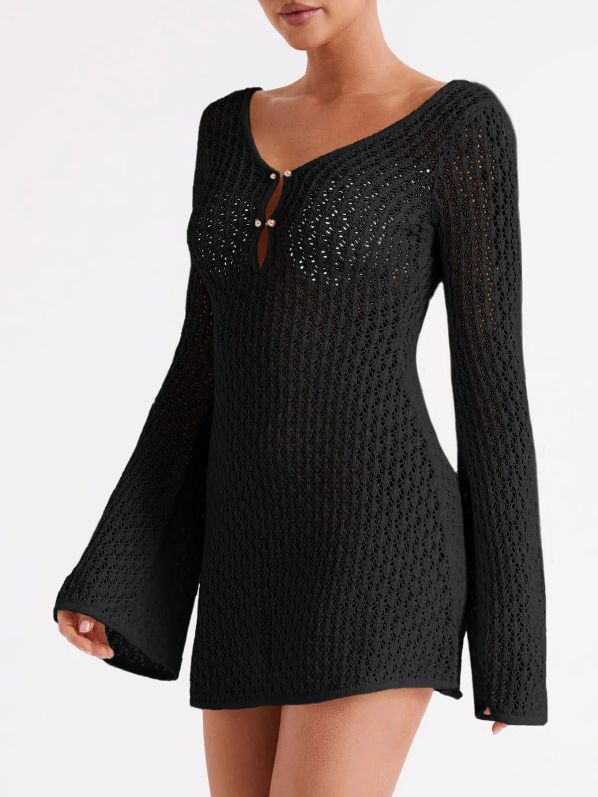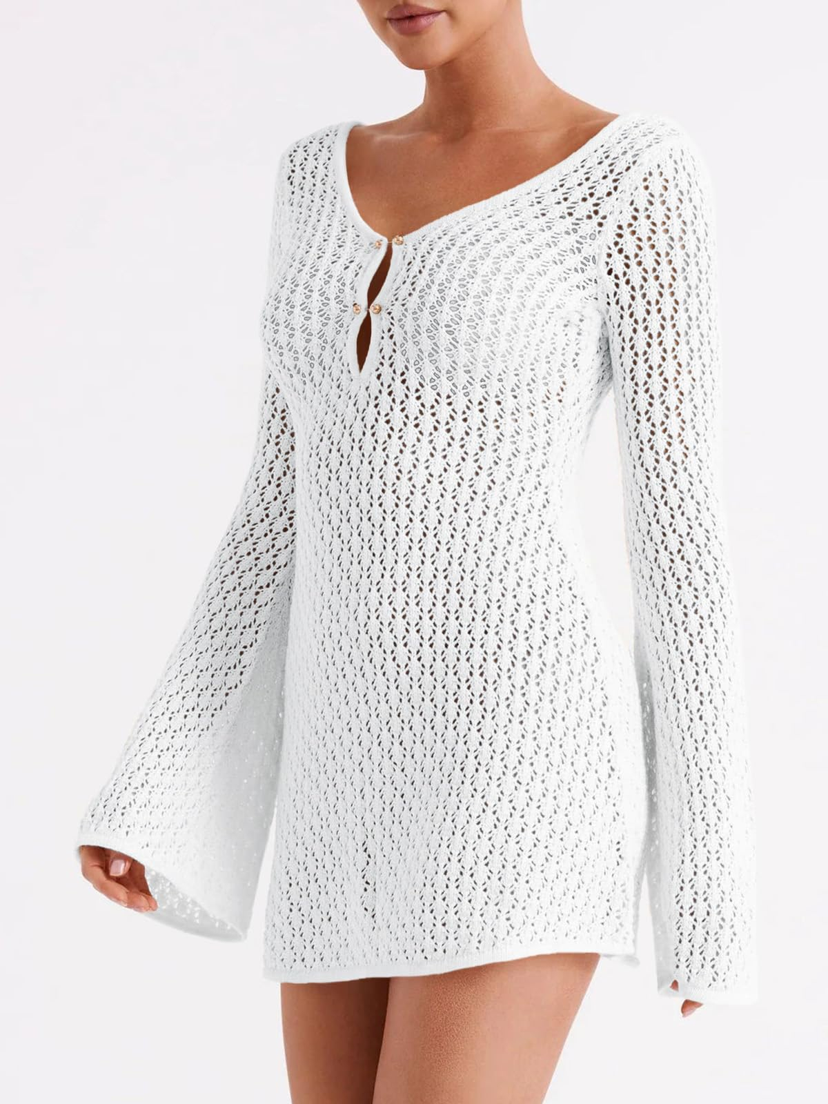 Feature: Bathing suit cover up features long bell sleeve, slim fit, crochet hollow out, semi-sheer, sexy off the shoulder, back and front v neck, mini length, knitted fabric, chic and sexy style. The cut out design in the front adds a sexy touch. Beach vacation cover dress, beach coverups for women 2026.