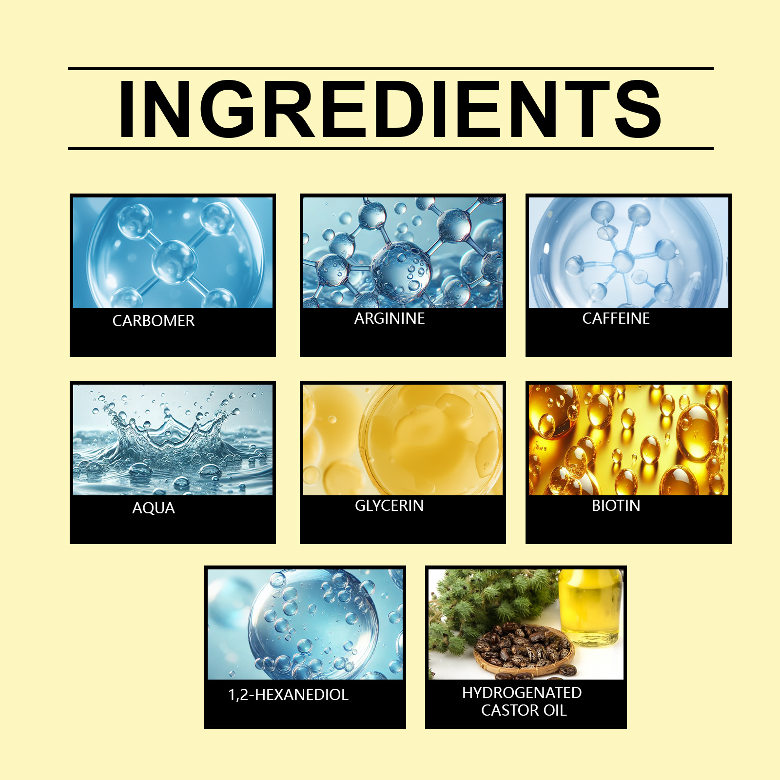 Ingredients: water, glycerin, hydrogenated castor oil, 1,2-hexanediol, carbomer, arginine, biotin, caffeine.