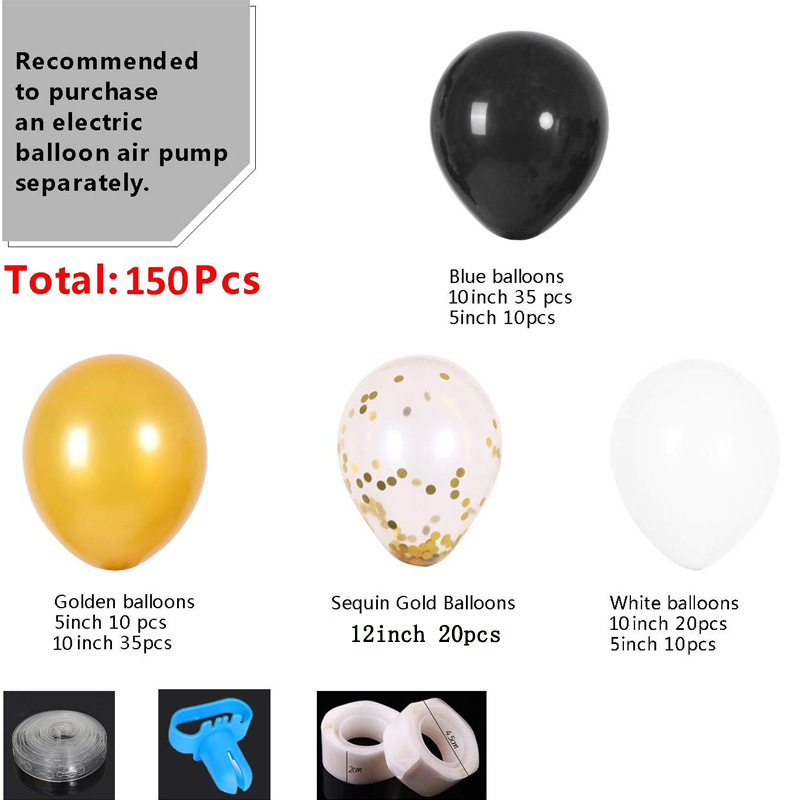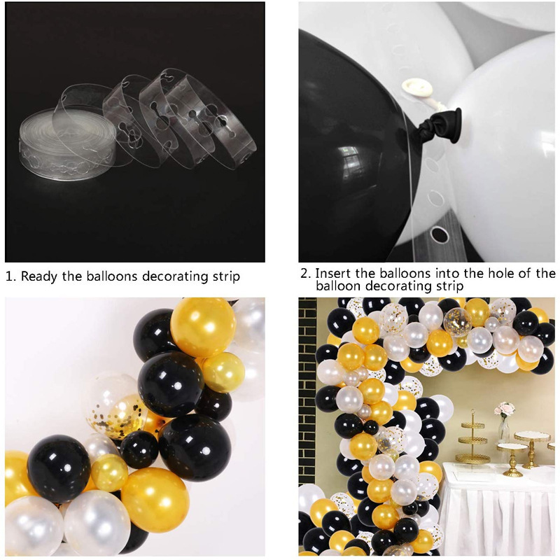 20 12-inch golden sequined balloons + 20 10-inch white latex balloons + 35 10-inch golden latex balloons + 35 10-inch black latex balloons + 10 5-inch golden latex balloons + 10 5-inch white latex balloons + 5 inches 10 black latex balloons + 1 glue dot + 1 hinge + 1 knotter