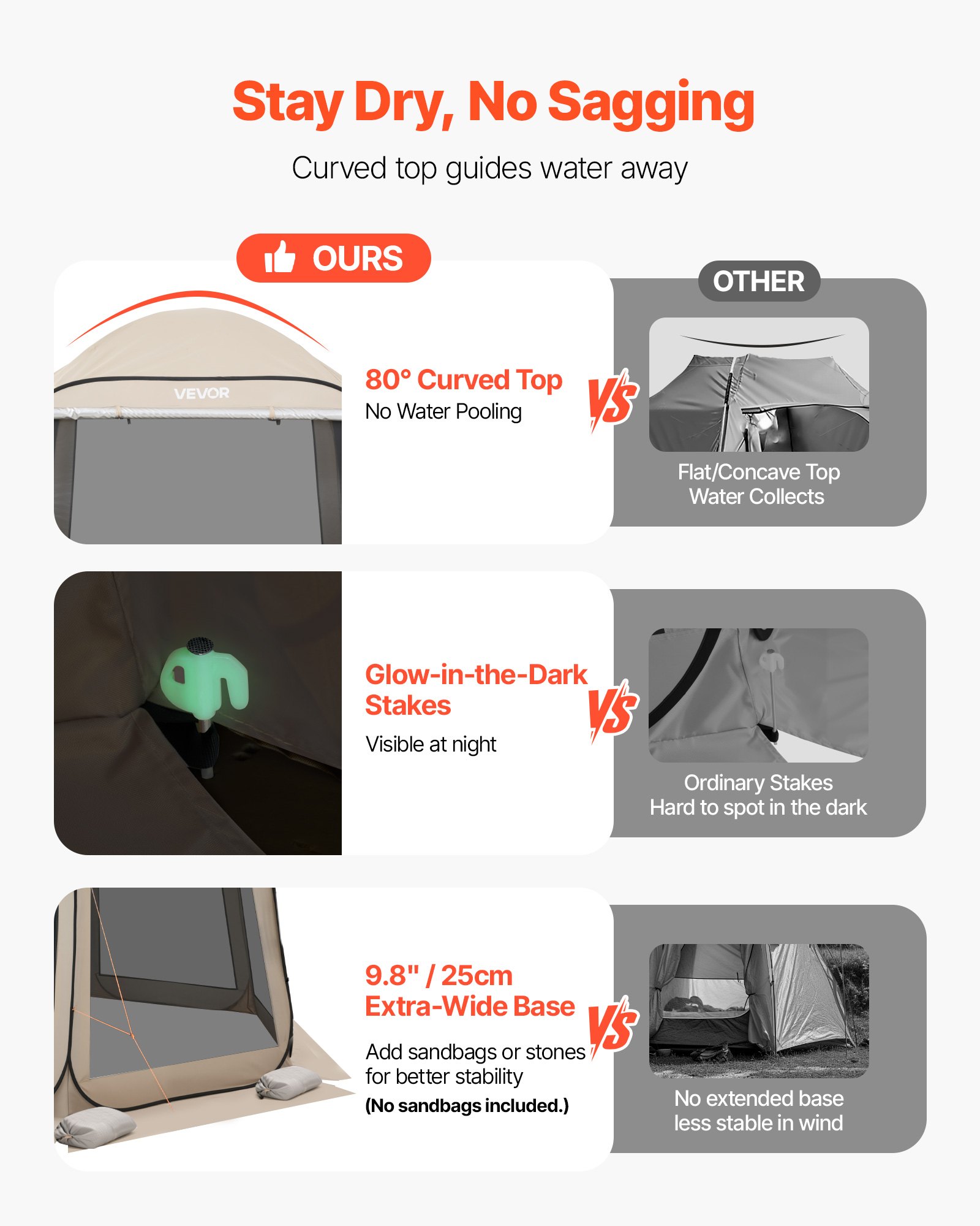 Stable & Windproof Structure: Reinforced fiberglass and steel poles keep the pop up screen tent upright even in windy conditions. The curved top design avoids water pooling and sagging