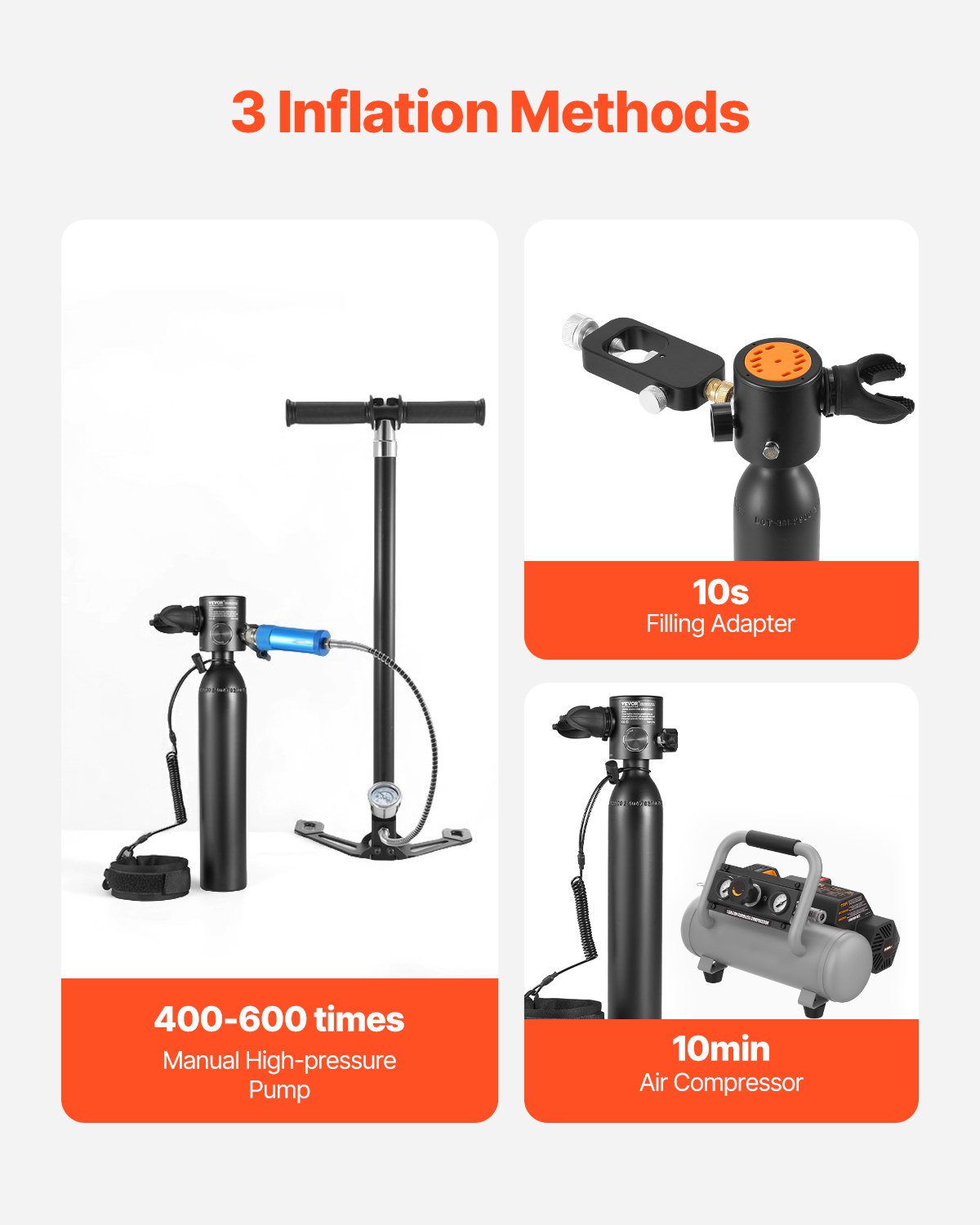 Three Inflation Options: Whether you use a supplementary adapter, air compressor, or manual pump, this scuba tank kit provides flexibility in how you inflate. All parts fit neatly into the included carrying bag, making it super easy for travel. (Note: charging tools sold separately.)