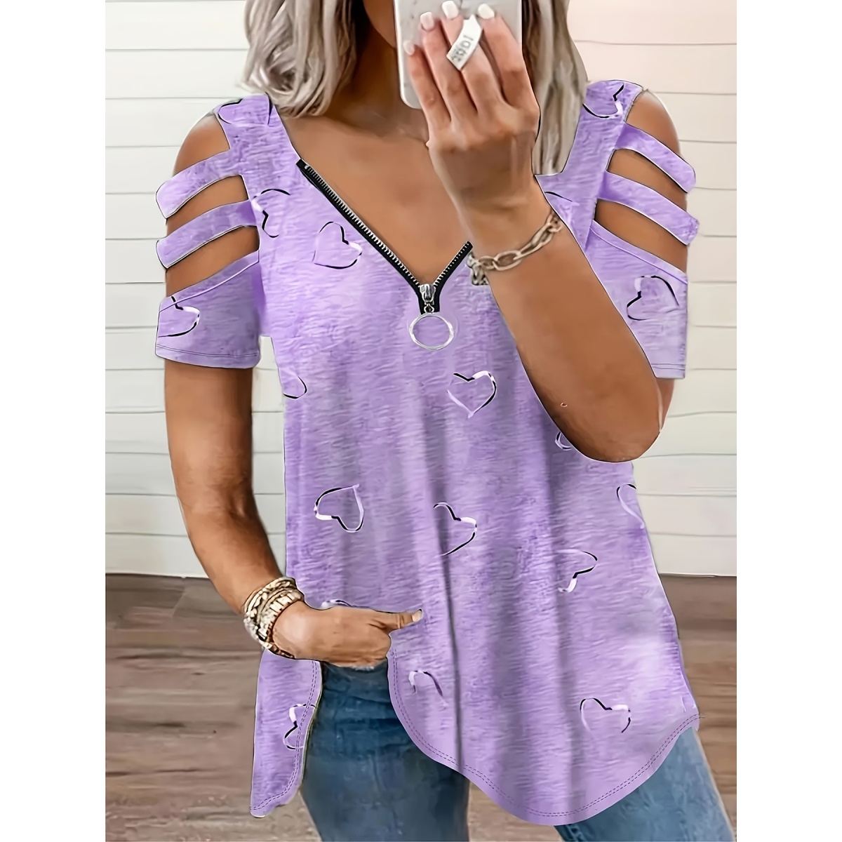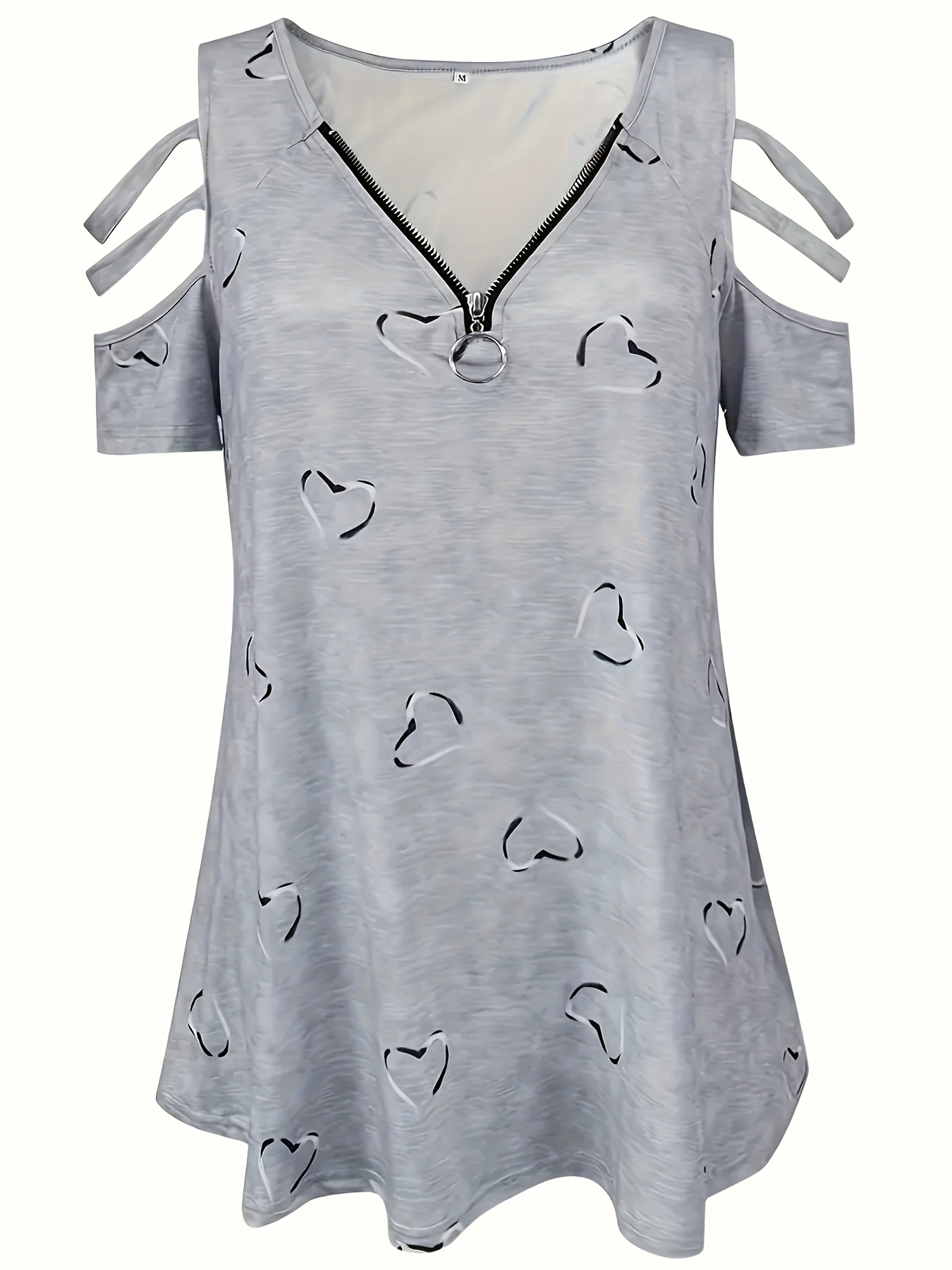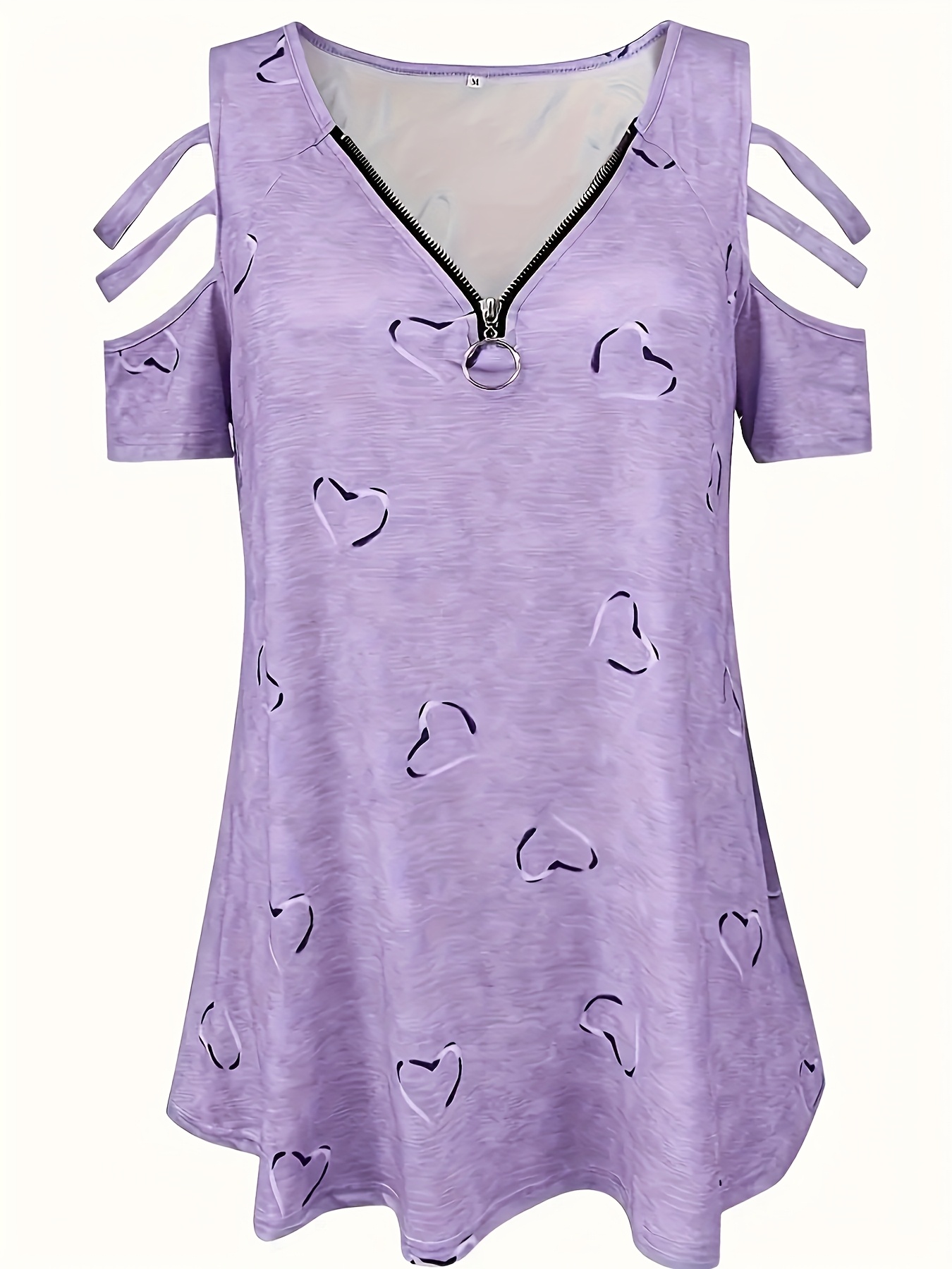 Self-pick-up Plus Size Women'S Casual Heart Print Zipper Short Sleeve Off Shoulder T-Shirt Only Self-pickup Is Supported