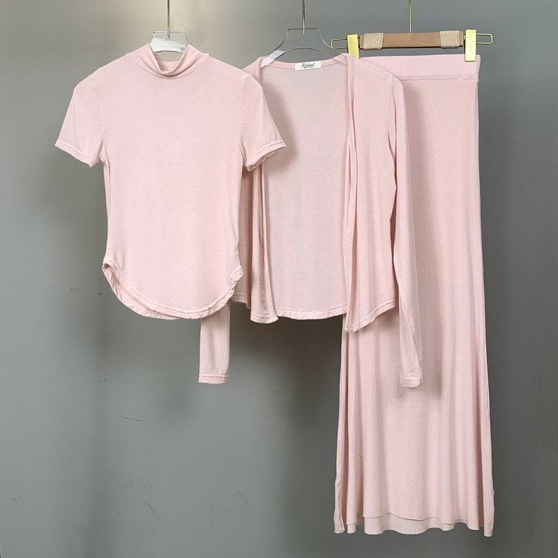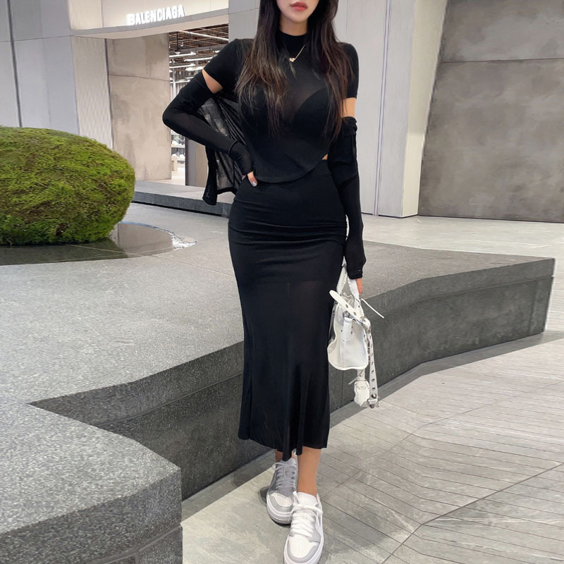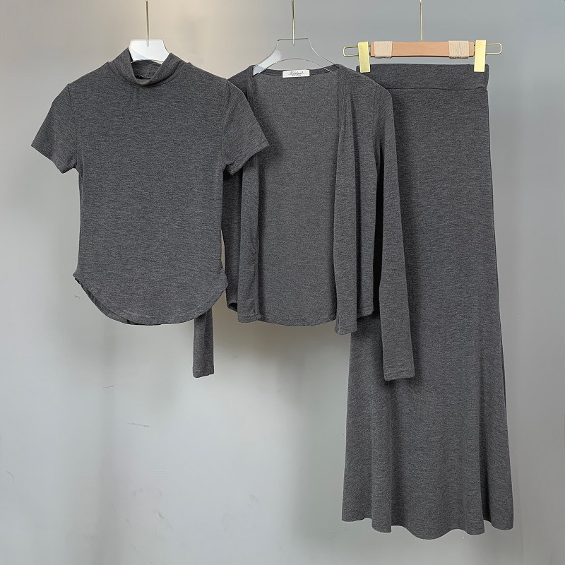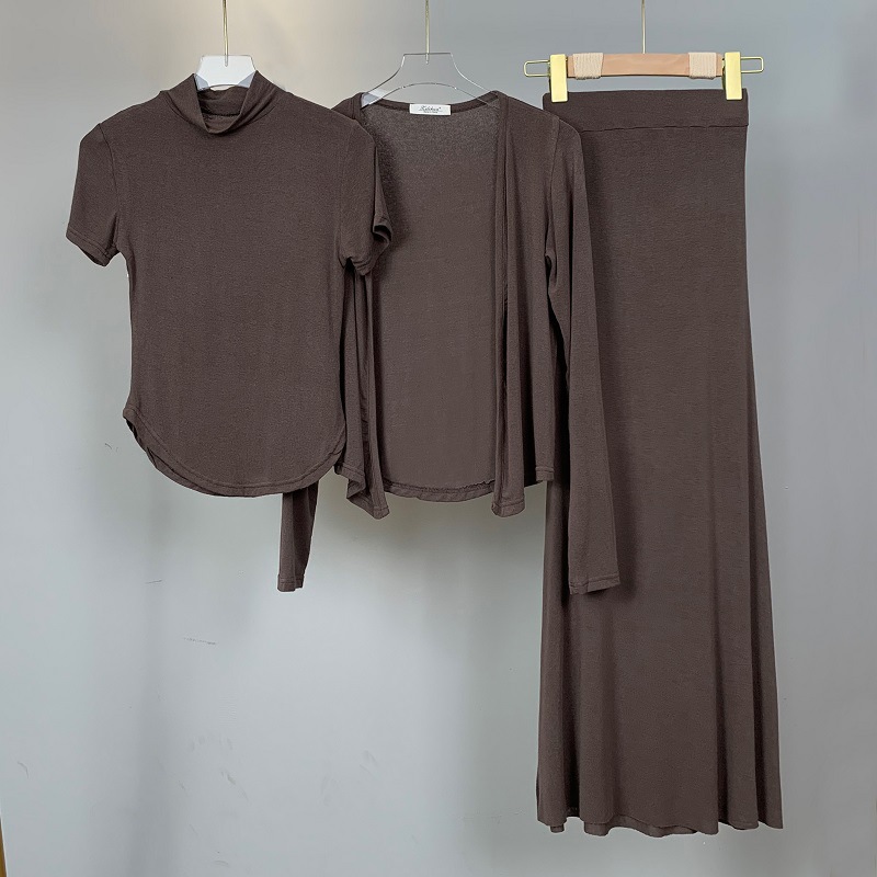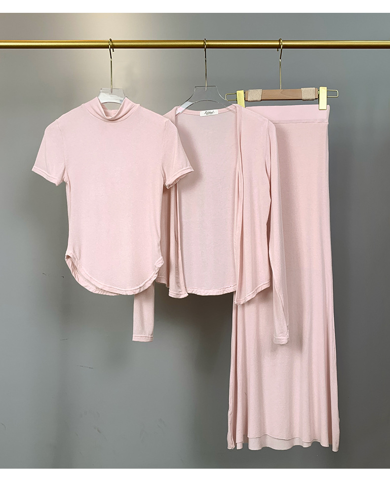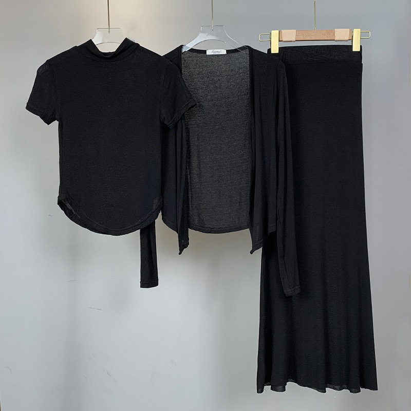 Semi-high Neck Short-sleeve T-shirt Cardigan Fishtail Skirt Three-piece Set For Women