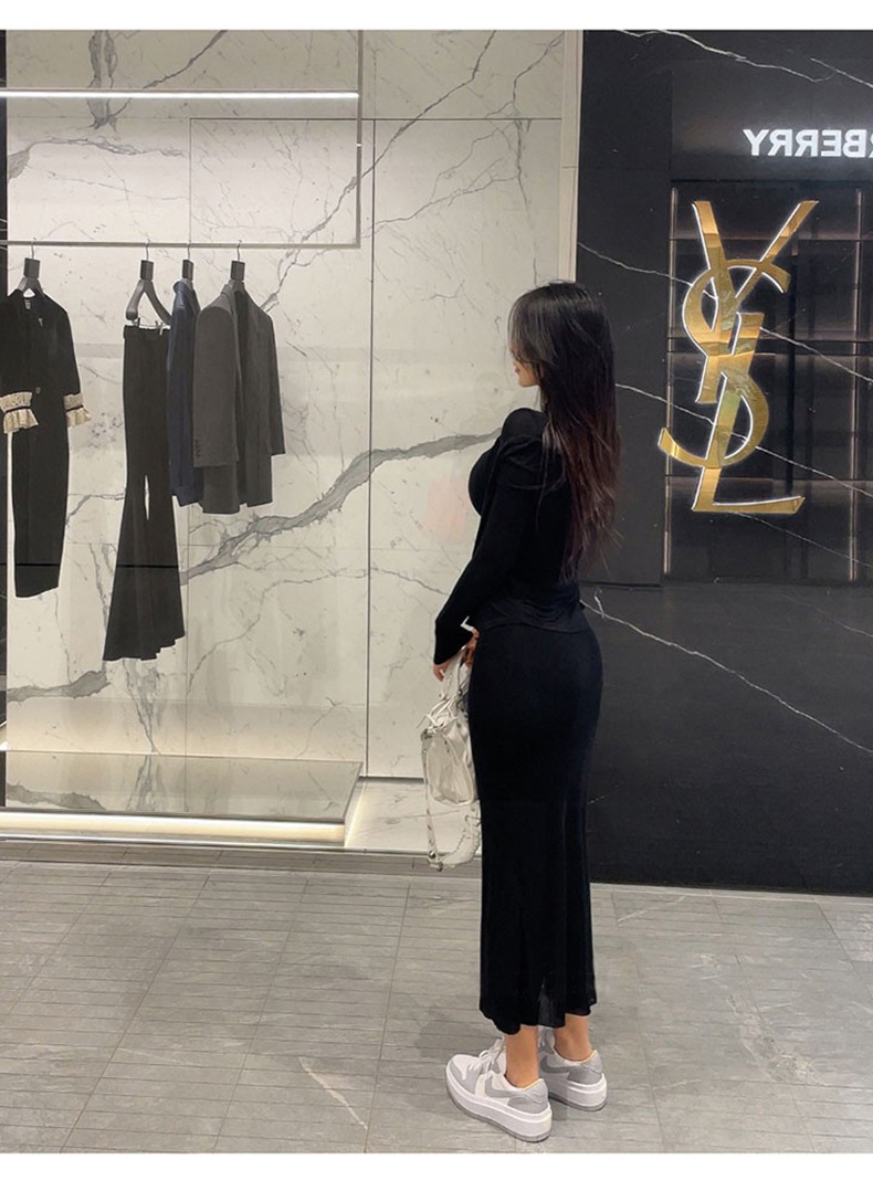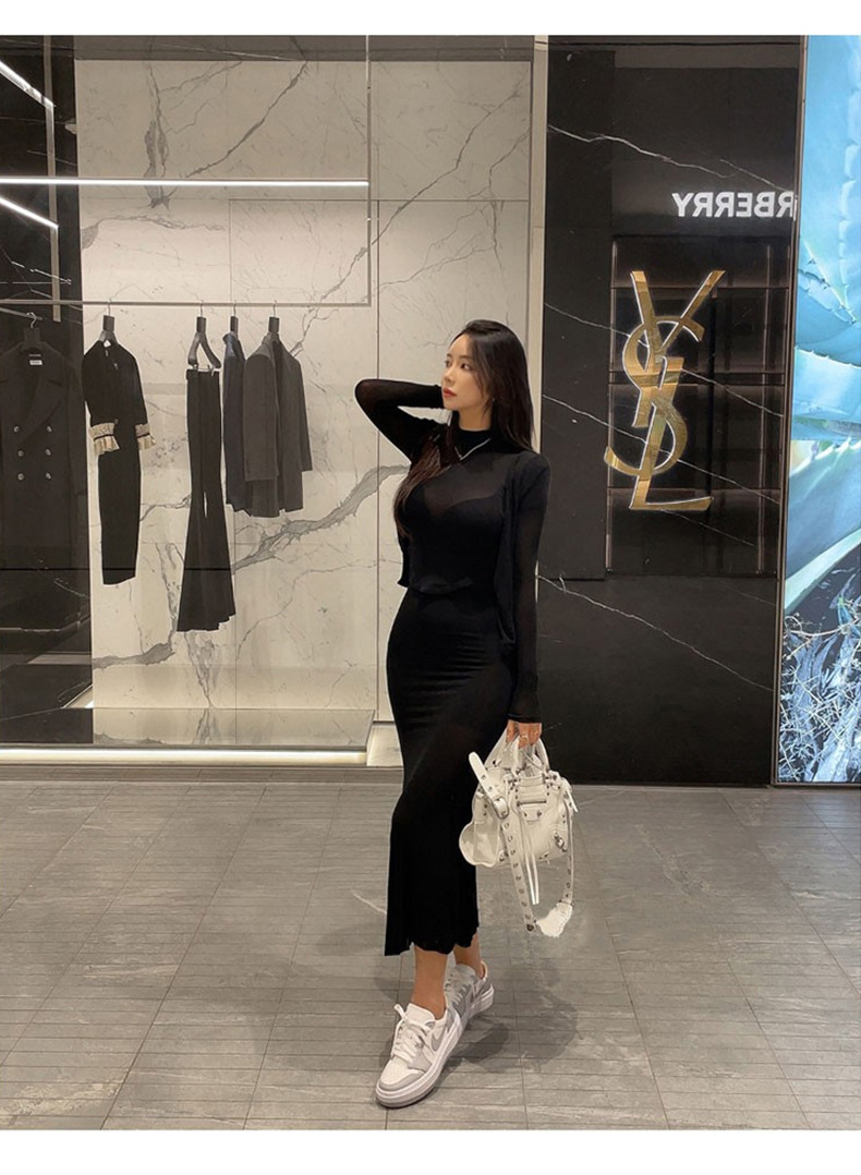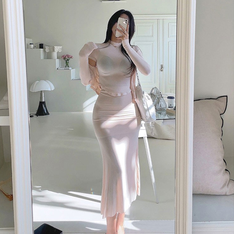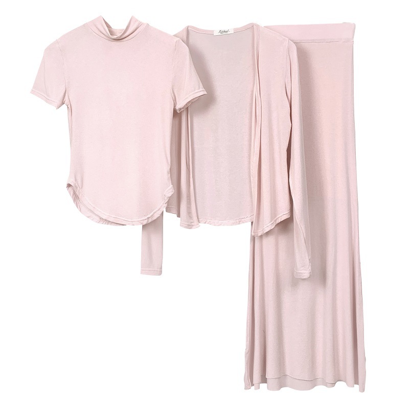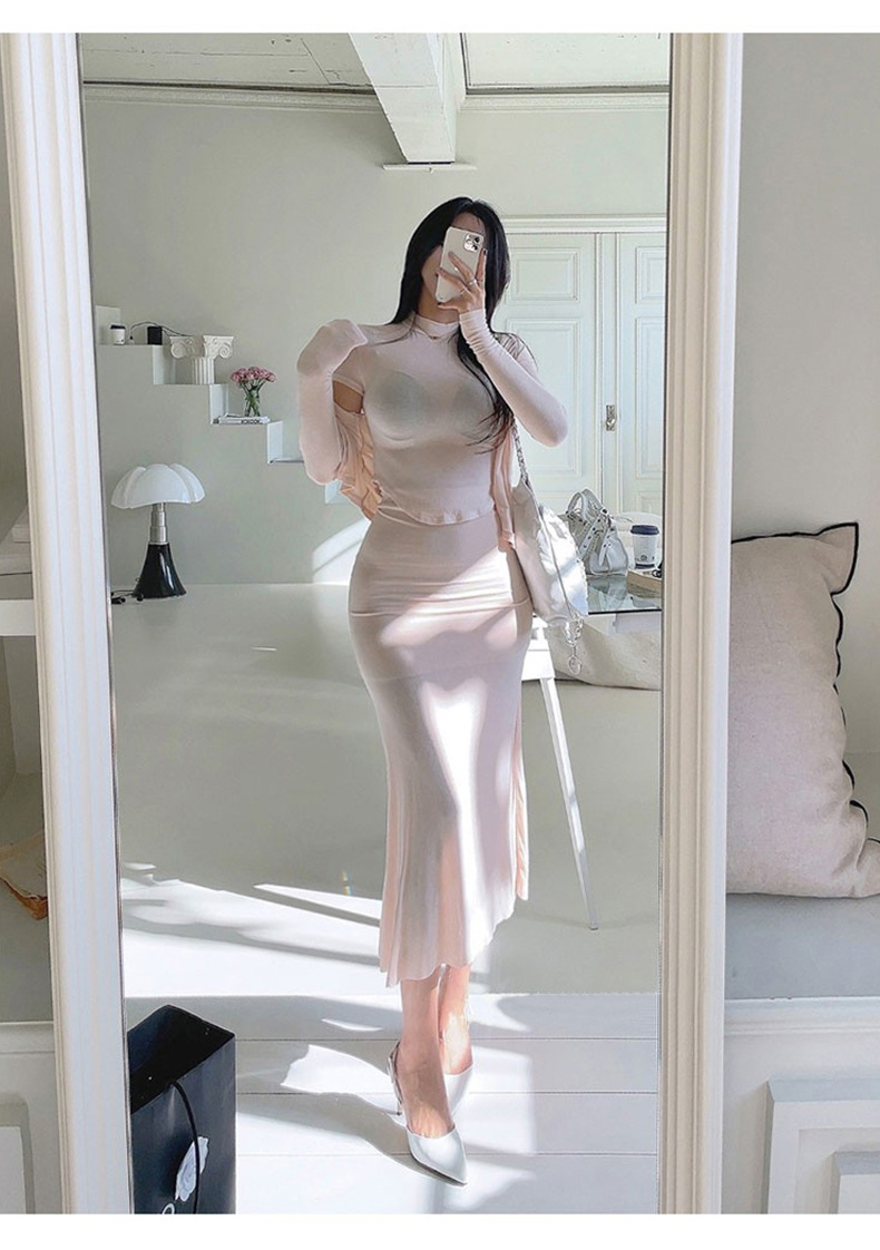 Semi-high Neck Short-sleeve T-shirt Cardigan Fishtail Skirt Three-piece Set For Women