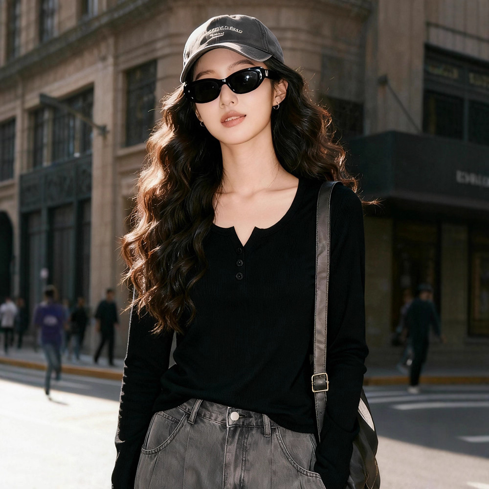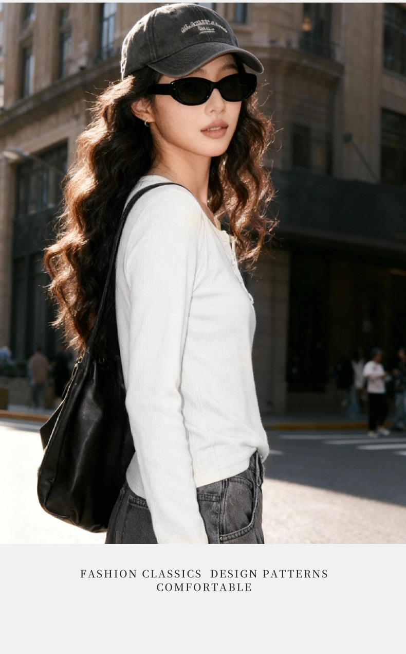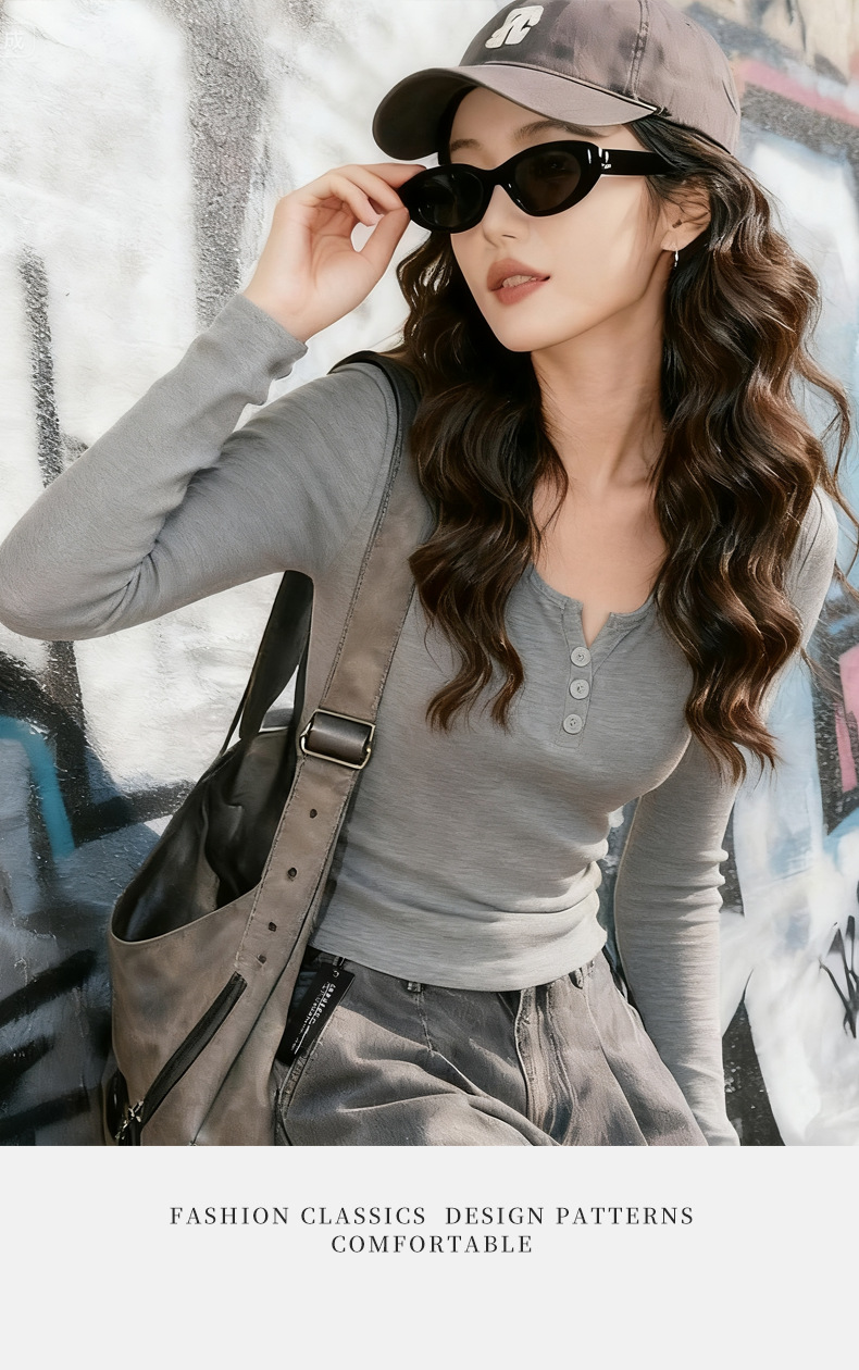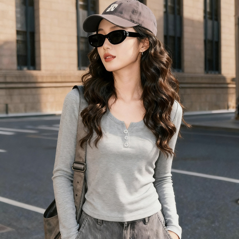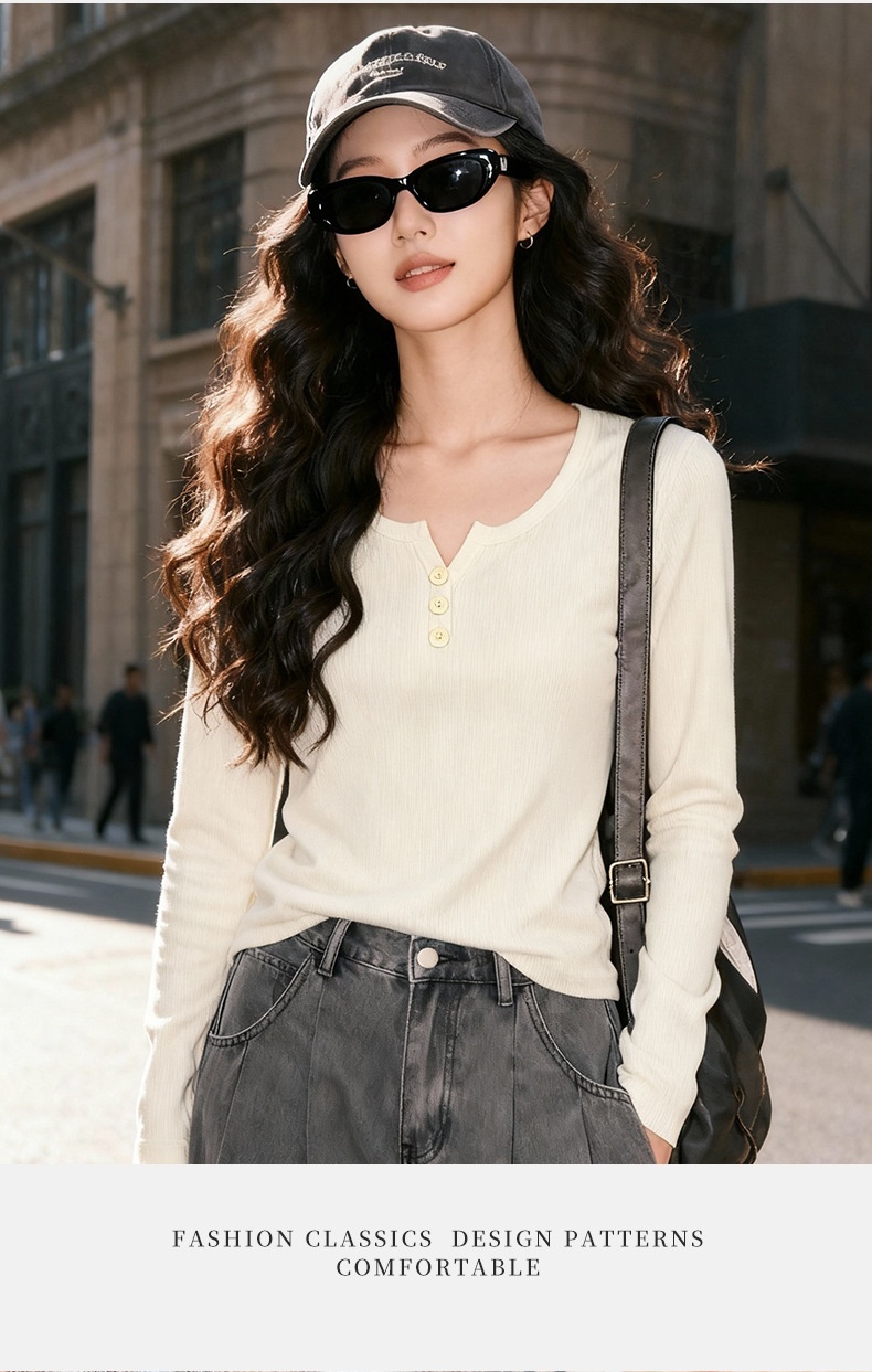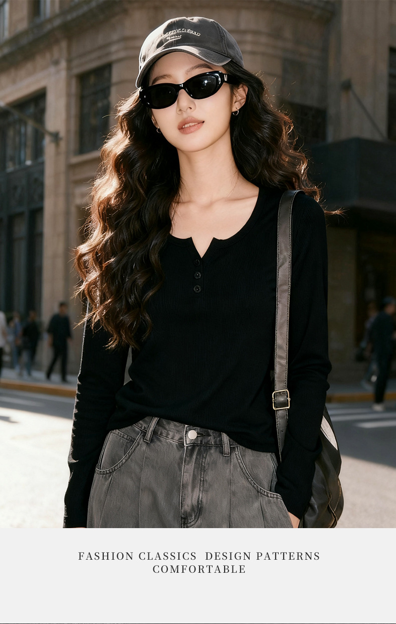 Semi-open Round Neck T-shirt Women's Slim-fit Top