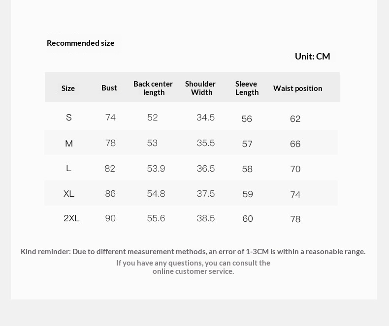 Note: 1. Asian sizes are 1 to 2 sizes smaller than European and American people. Choose the larger size if your size between two sizes. Please allow 2-3cm differences due to manual measurement. 2. Please check the size chart carefully before you buy the item, if you don't know how to choose size, please contact our customer service. 3.As you know, the different computers display colors differently, the color of the actual item may vary slightly from the following images.