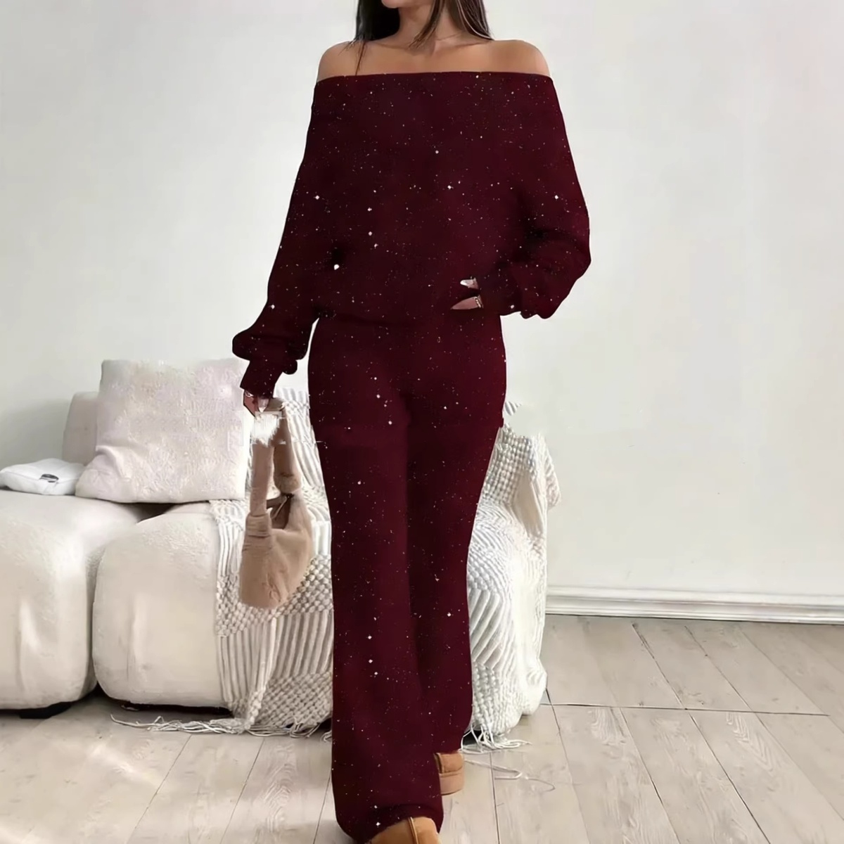 Sequined Off-the-Shoulder Long Solid-Color Womens Suit