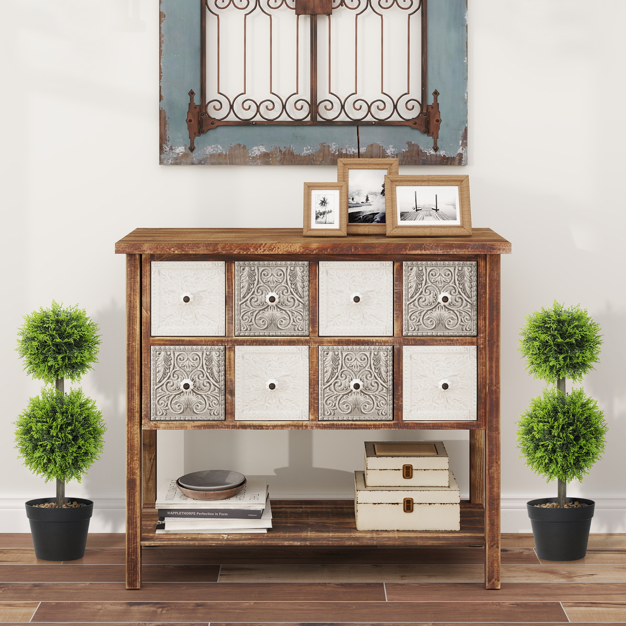 • Set of two topiary ball-shaped boxwood trees enhance room aesthetics