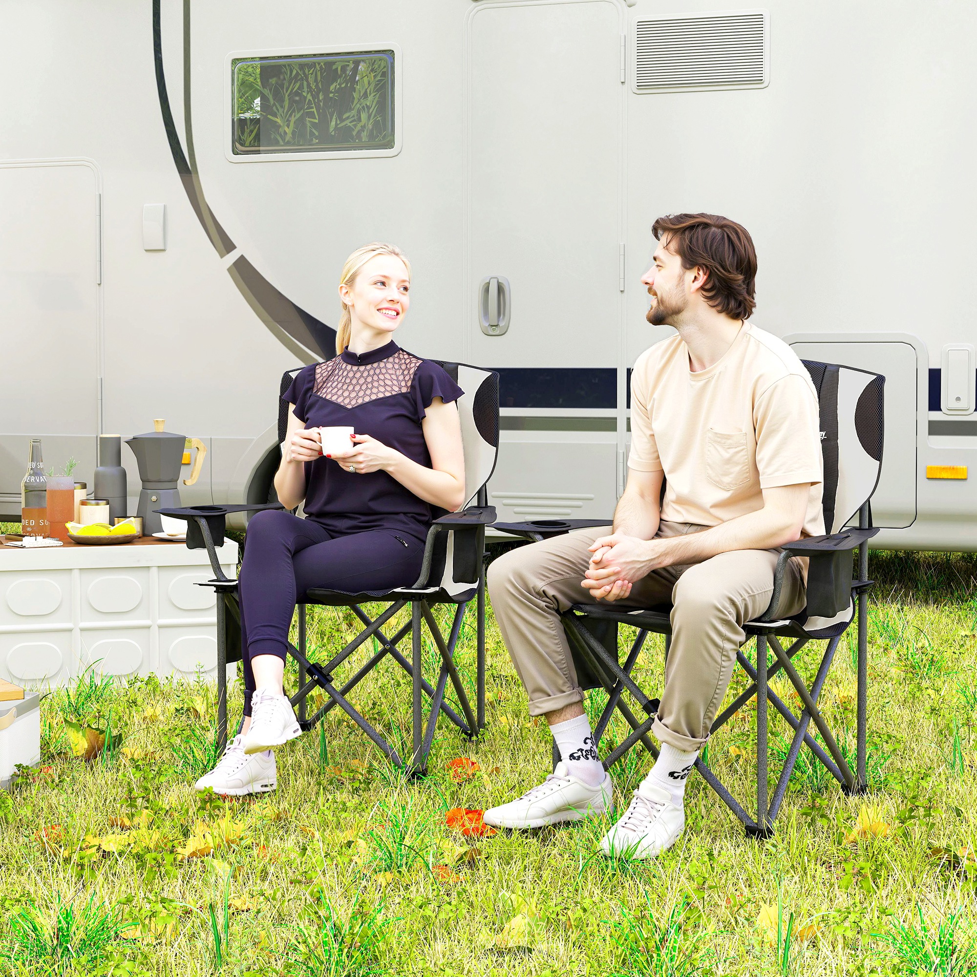 Discover the comfort of the camping chairs for adults, a set of 2 that transforms any outdoor sitting into a comfortable retreat. Enjoy the luxury of a supportive headrest and full padding, crafted with a robust metal frame and splash-resistant Oxford fabric. Complete with a cup holder and cooler bag, our folding chairs are your go-to for effortless outdoor relaxation.