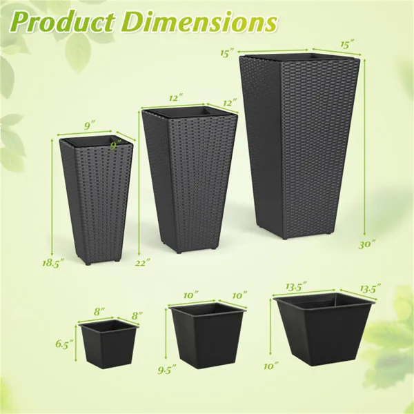 Color:Black Material:PP Rattan, Plastic, Metal Product Dimensions of Large Planter:15" x 15" x 30" Product Dimensions of Medium Planter:12" x 12" x 22" Product Dimensions of Small Planter:9" x 9" x 18.5" Dimensions of Large Inner Box:13.5" x 13.5" x 10" Dimension of Medium Inner Box:10" x 10" x 9.5" Dimension of Small Inner Box:8" x 8" x 6.5" Large Planter Capacity:26 gal/100L Medium Planter Capacity:13 gal/50L Small Planter Capacity:6 gal/23L Large Inner Box Capacity:7.4 gal/28L Medium Inner Box Capacity:4.2 gal/16L Small Inner Box Capacity:1.6 gal/6L Total Net Weight:13 lbs Is Assembly Required:Yes