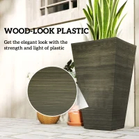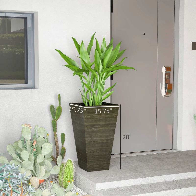 Landscaping is easy with the right supplies by your side. Outsunny's tall planter set gives the depth you need to grow long roots without taking up extra room when it's time to store for the season. Grow flowers, herbs, shrubs, ferns, or a ficus. Our large planter set is self-draining, so water logging won't be a worry. They're stackable to keep compact when not in use. Featuring a modern shape with a wood grain look, their material doesn't saturate to endure the outdoors season after season. Features: - Set of 3 outdoor flower pots with a stackable design to save space - Tall build - Polypropylene with a faux wood look makes them light and water-safe - Bottom drainage holes with a plastic plug on each plant pot for water draining - Suitable for your lawn, deck, patio, balcony, or yard - No assembly needed Specification: - Color: Brown - Material: Polypropylene - Overall Dimensions: 15.75" L x 15.75" W x 28" H - Planting Dimensions: 15.25" L x 15.25" W x 26.75" H - Volume: 13.25 Gallon - Weight Capacity: 66 lbs. - Item Label: 84H-042V00TE Package Includes: - 3 x Planter Landscaping is easy with the right supplies by your side. Outsunny's outdoor planter set gives the depth you need to grow long roots without taking up extra room when it's time to store for the season. Our tall planter set is self-draining, so water logging won't be a worry. Features: - Set of 3 outdoor flower pots with a stackable design to save space - Tall build - Polypropylene with a faux wood look makes them light and water-safe - Bottom drainage holes with a plastic plug on each plant pot for water draining - Suitable for your lawn, deck, patio, balcony, or yard - No assembly needed Specification: - Color: Dark Brown - Material: Polypropylene - Overall Dimensions: 15.75" L x 15.75" W x 28" H - Planting Dimensions: 15.25" L x 15.25" W x 26.75" H - Volume: 13.25 Gallon - Weight Capacity: 66 lbs. - Item Label: 84H-042V00DR Package Includes: - 3 x Planter.