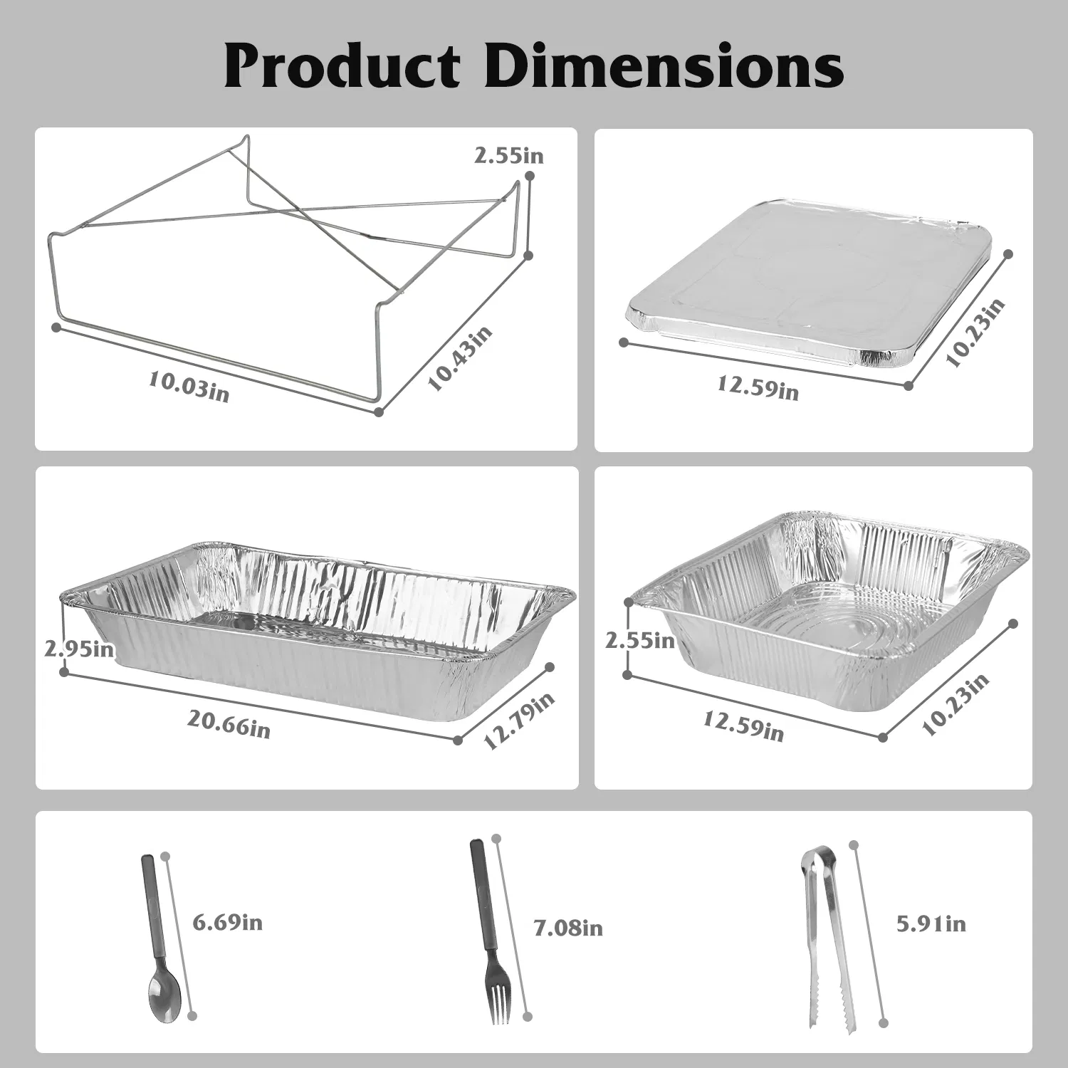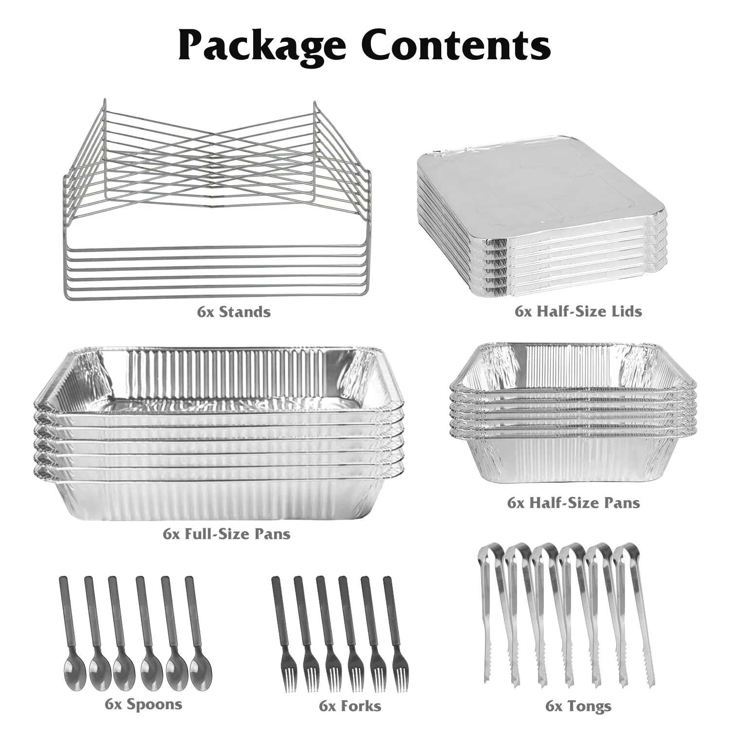 *42Pcs Complete Chafing Dish Set*:An all-in-one solution for creating a pleasant and incredible buffet party experience. Our disposable chafing and buffet dish set includes 6x half-size pans and lids,6x full-size pans,6x stands,6x forks,spoons and tongs,you can get everything you need for catering supplies.