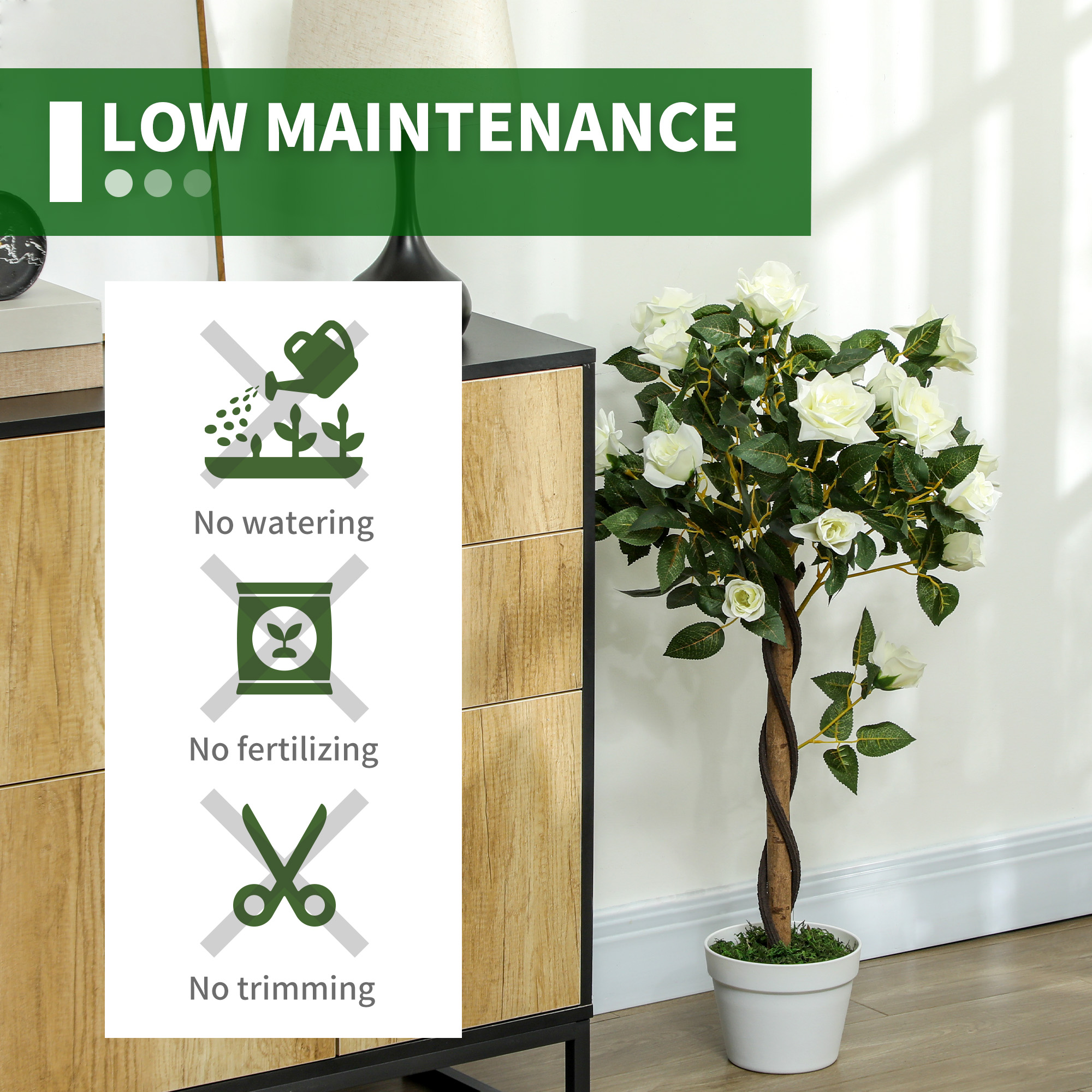 Bring bright and beautiful colour into home s areas without the stress of upkeep. Choose this artificial tree to breathe life into your space this season and beyond. This faux plant is extremely realistic to look at and touch, making it easy to mistake it for a real plant. The indoor plant with a pot, which is filled with grass-looking cement soil to keep the fake tree standing upright all day and night long.