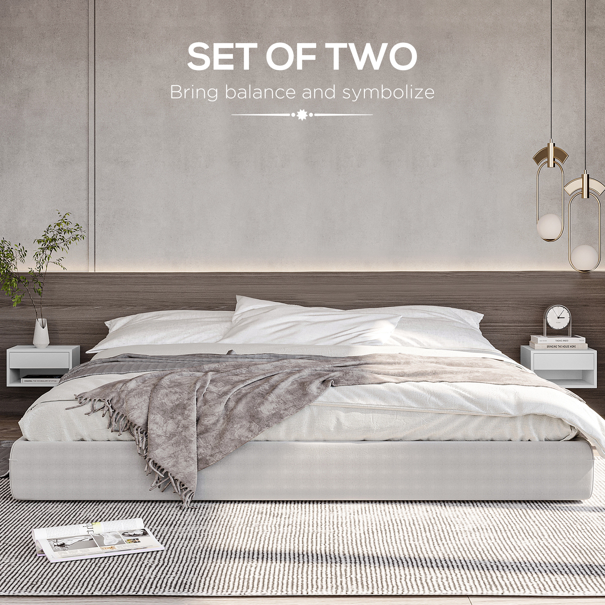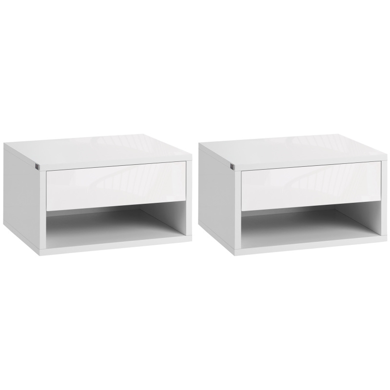 These two bedside tables offer you double the storage for a single package. Set up together in the same space or just separately: do it your way. Made from particle board, each nightstand is solid, featuring a drawer and an open shelf, with a flat top: plenty to hold bedtime essentials. Fixed to the wall, no floor space is required for these floating nightstands.
