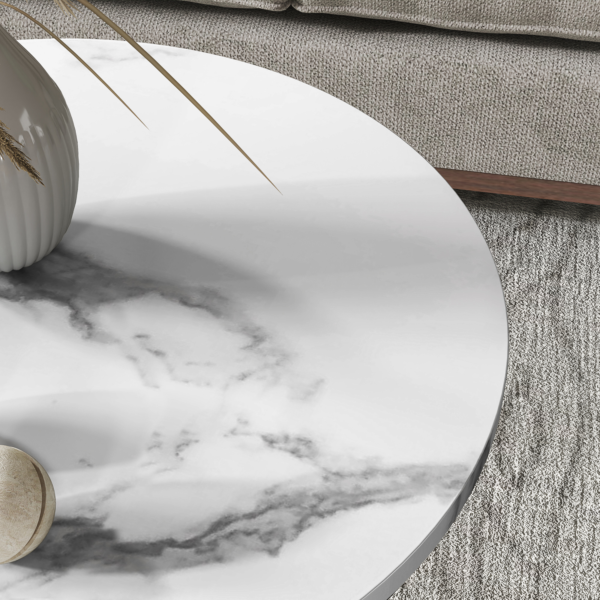 A beautiful addition to the everyday with this two-piece coffee table set. Both tables come in a two-tier design, offering plenty of holding space. This marble-effect tops, paired with the gold-tone legs mean an elegant look. With a steel frame for a strong core, the living room tables are complete with adjustable feet for balance.