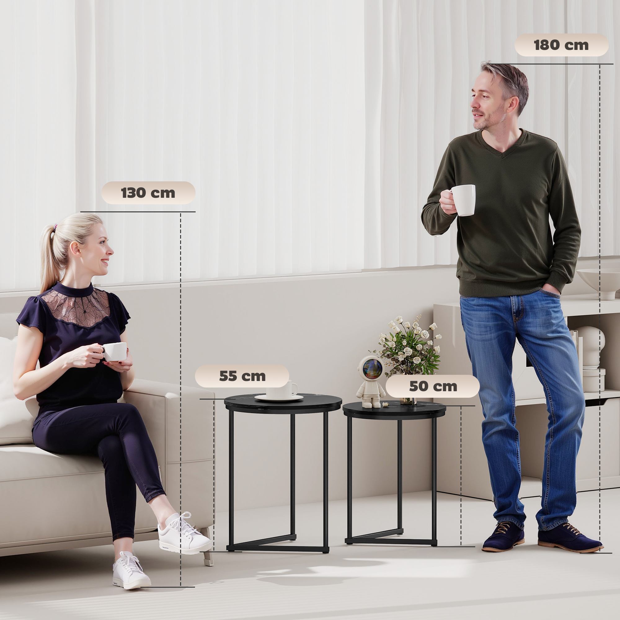 Double the elegance with this nesting table set. Comes with a small and a large table - use separately throughout the home, or together when you want to double the space. Marble-effect tabletops, paired with the black frame gives them a beautiful look: use as side tables in the lounge, hallway, bedroom and beyond.