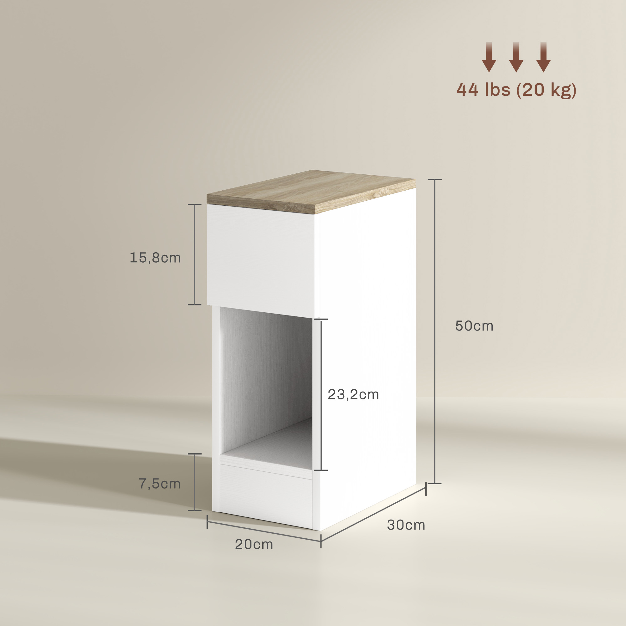 Thanks to the slim design of these two bedside tables, it's easy to maximise storage in your home and beyond. The simple design in white, with wood-effect tops makes these versatile pieces which work well in plenty of spaces, for plenty of different needs - bedside tables, side tables, or even as accent pieces. With a bottom shelf, drawer and flat top on both, there's also storage room to keep your space tidy and organised.
