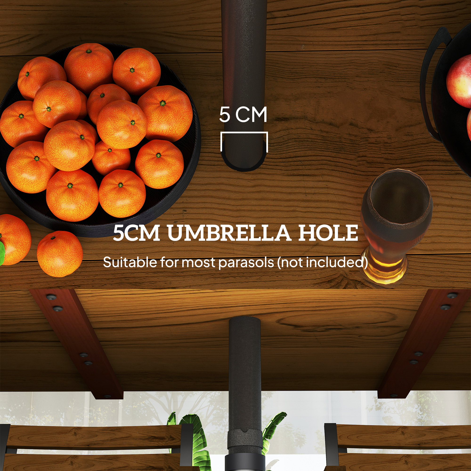 Style, bringing everyone together outdoors, with this seven-piece dining set. With a large dining table and six stacking chairs, there's enough room for friends and family. Powder coated steel frames mean a strong core, fitted with fir wood panels for a natural and beautiful touch. With the ⌀5 cm parasol hole in the table, you'll keep safely shaded with the garden umbrella of your choice.