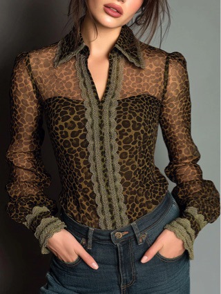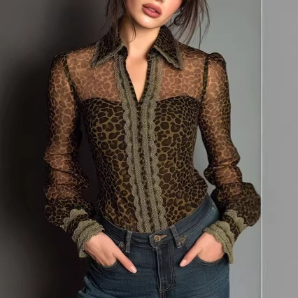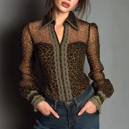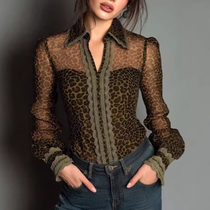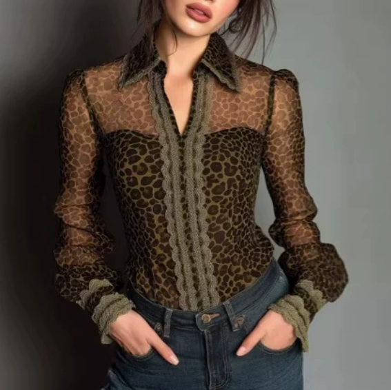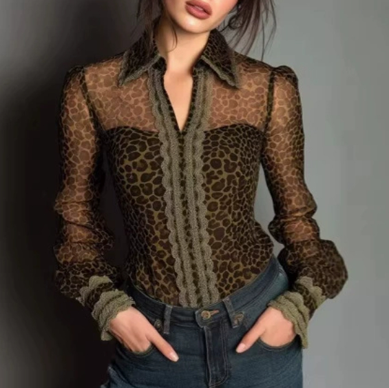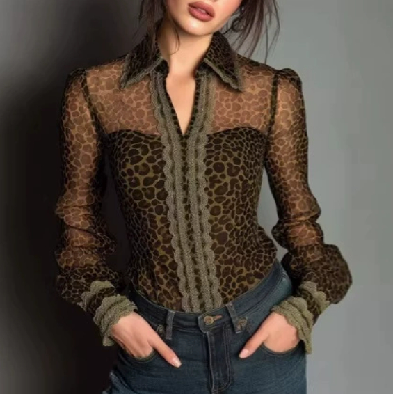 Sexy Lace Leopard-Print Vintage Long-Sleeve Top For Women