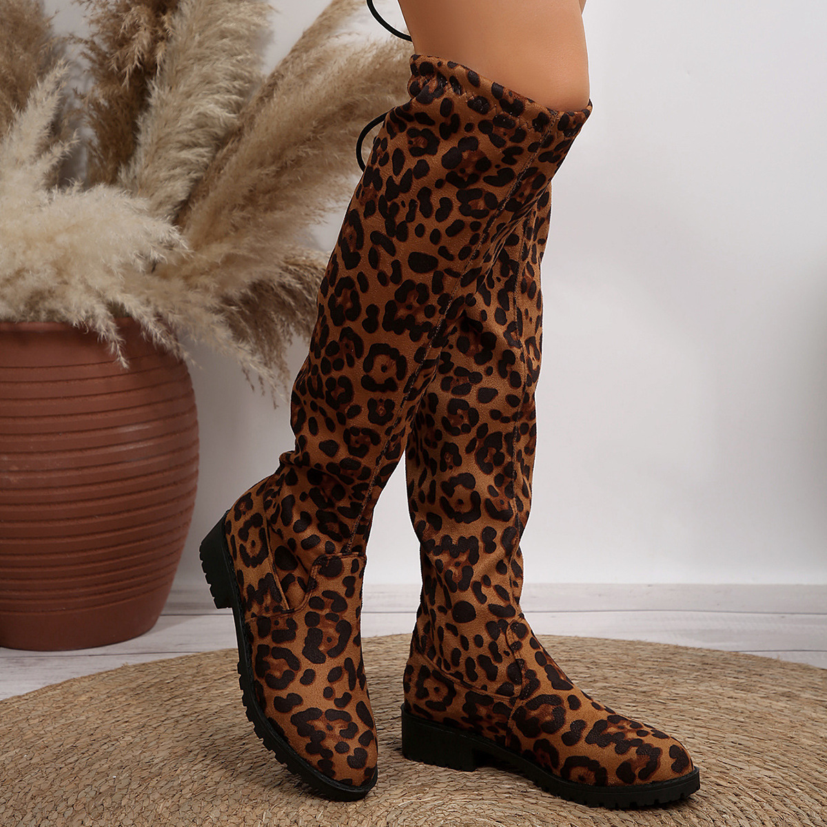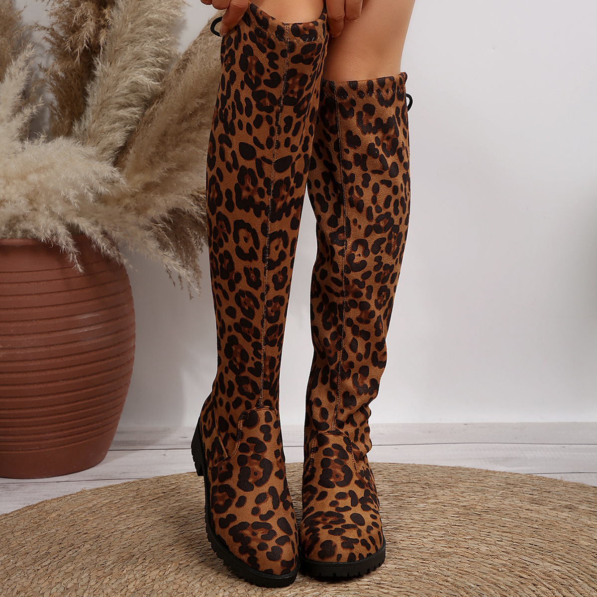 Sexy Leopard Over The Knee Boots With Back Lace-up Design Fashion High-tube Socks Shoes Winter Chunky Heels Long Boots