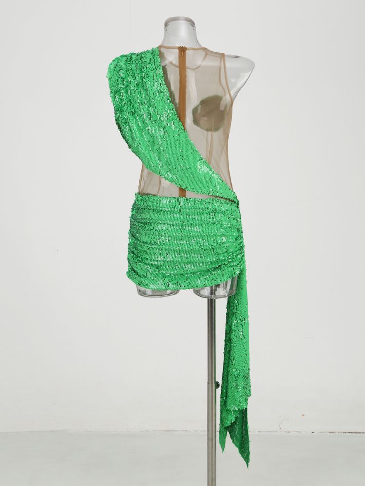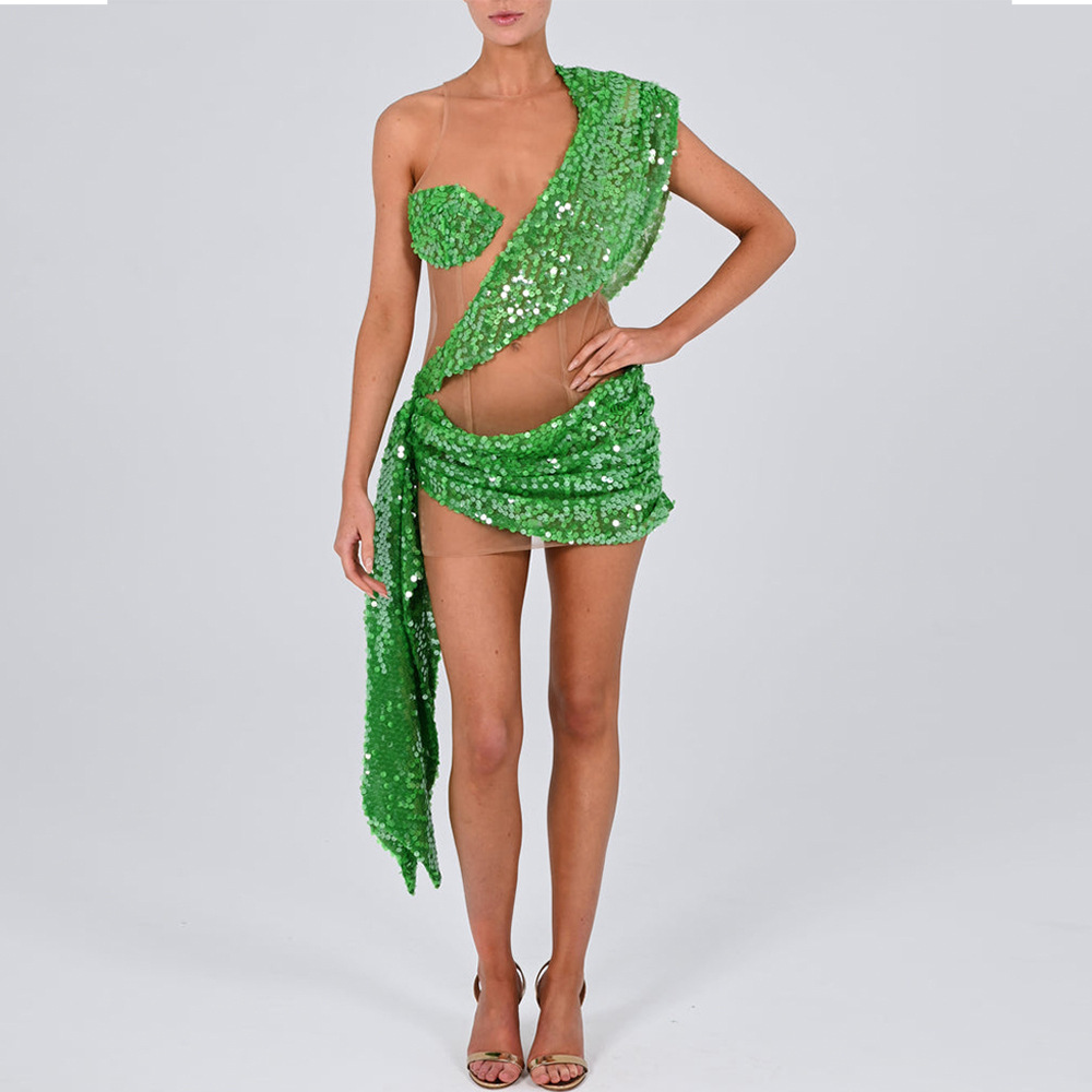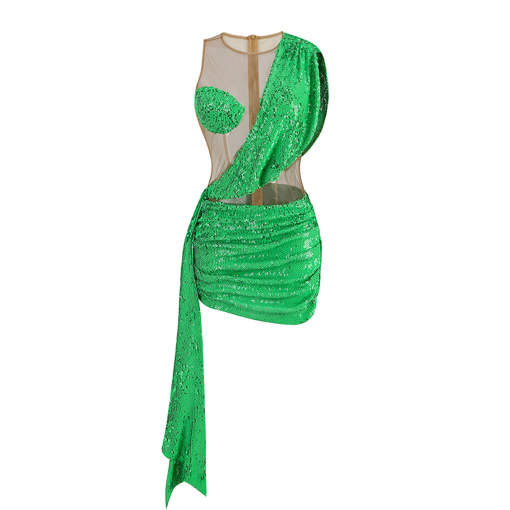 Sexy See-through Sequins Elegant Shoulder Stitching Dress