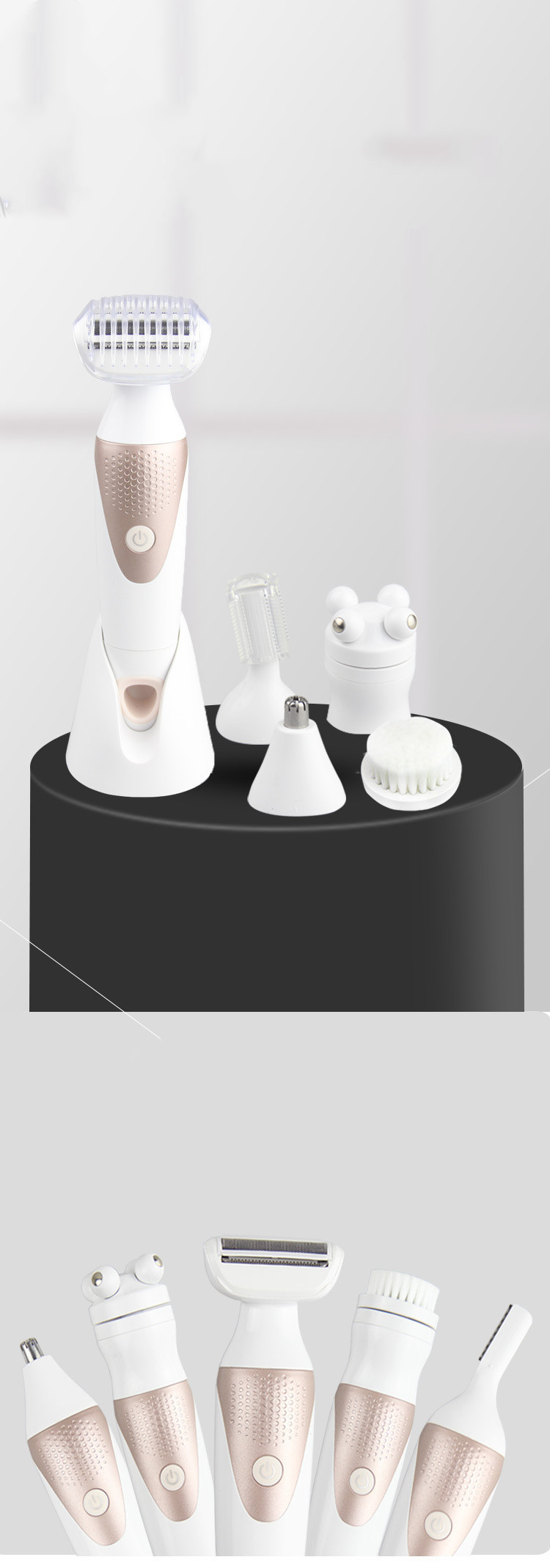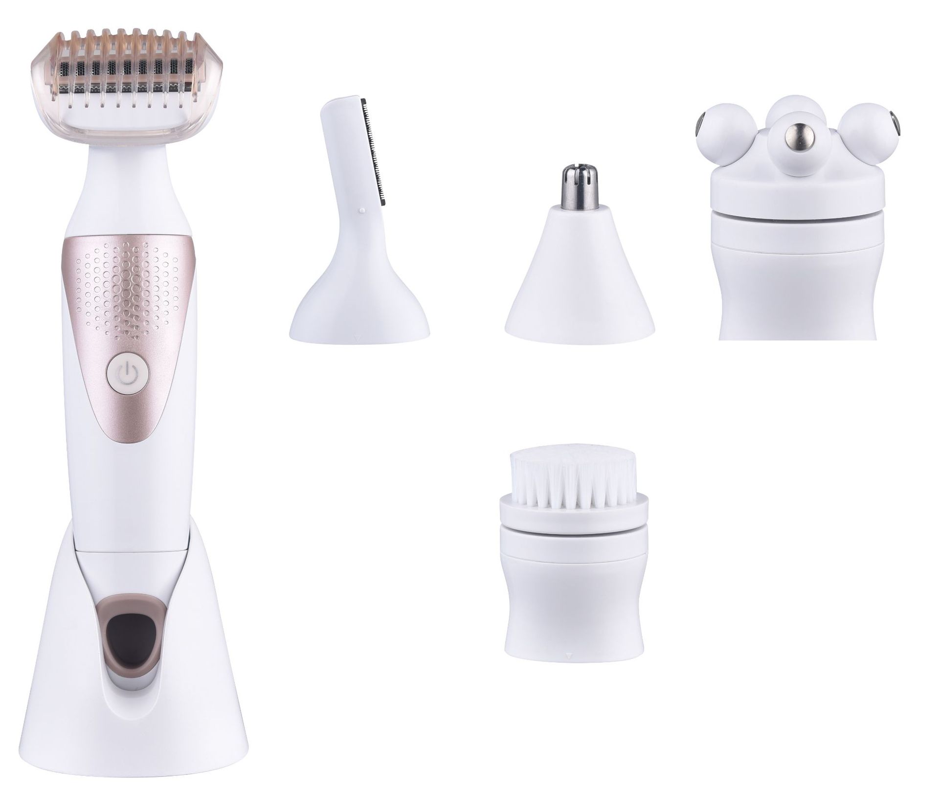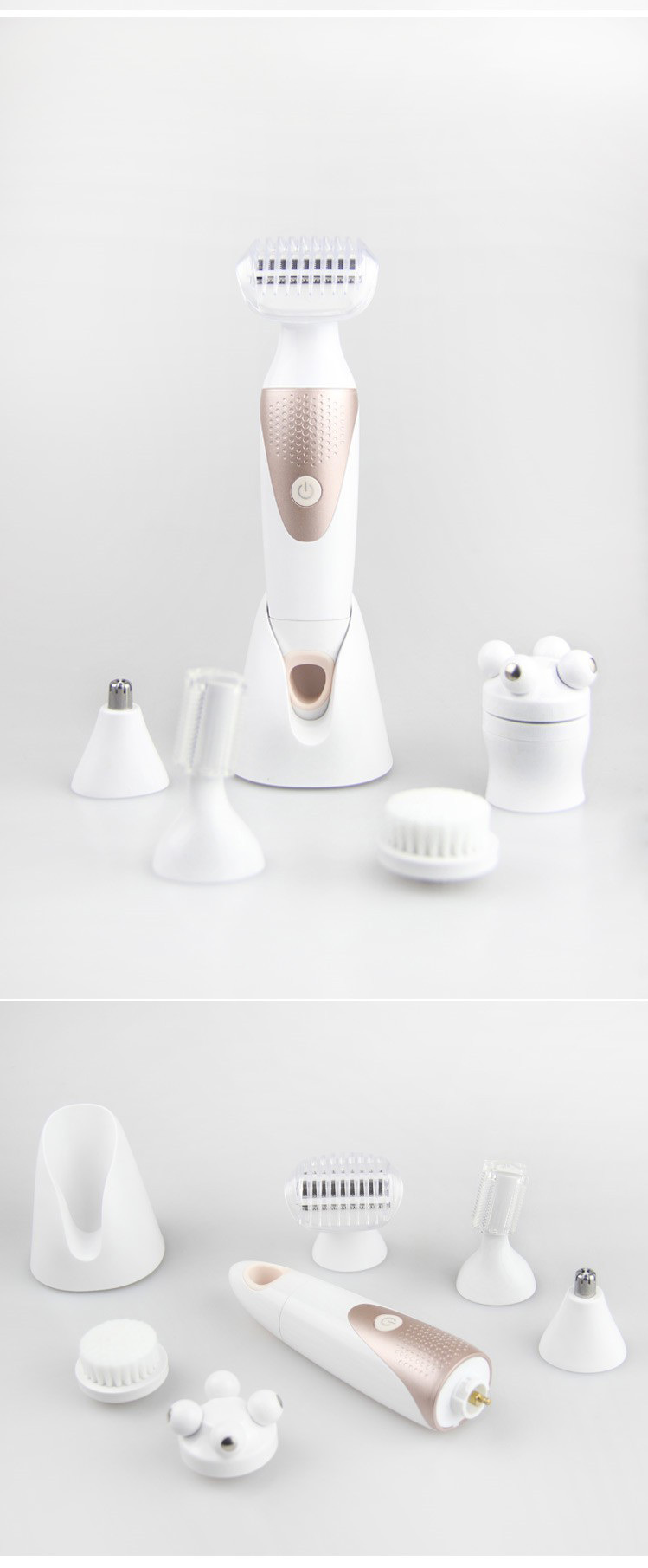 Product accessories: host + shaving head + eyebrow trimmer + nose hair trimming head + cleansing brush + massage head + base + charging cable + cleaning brush