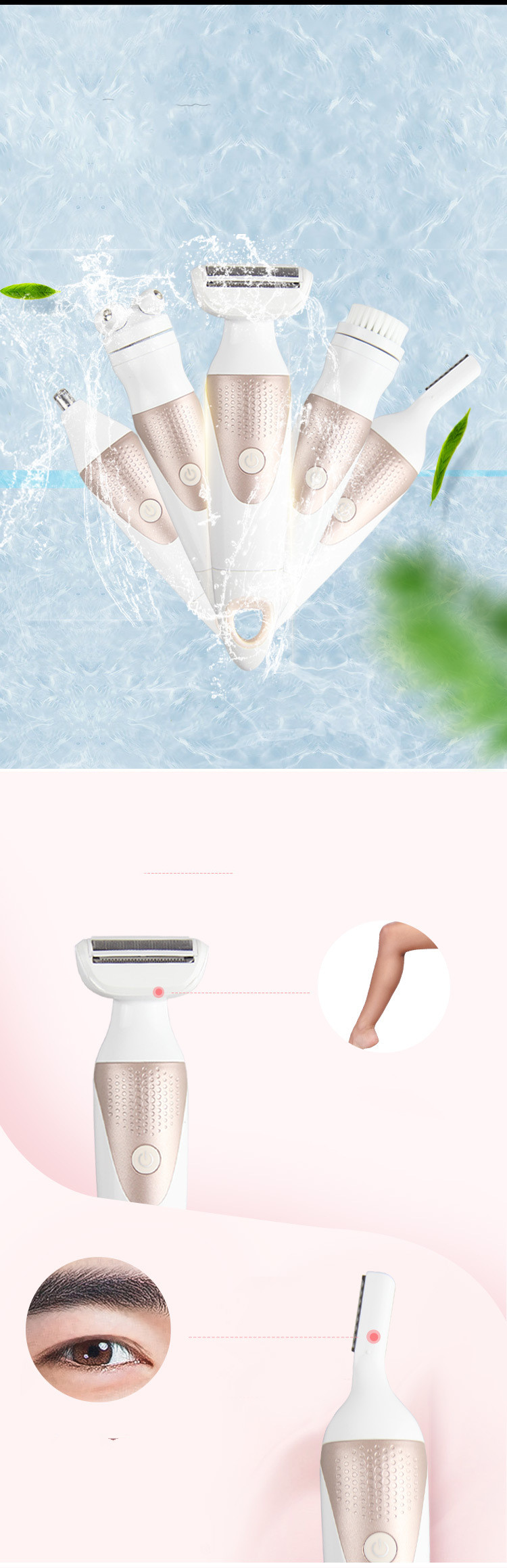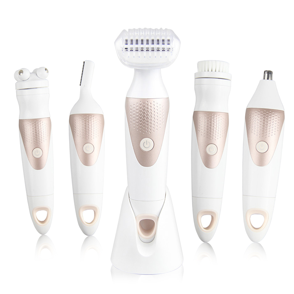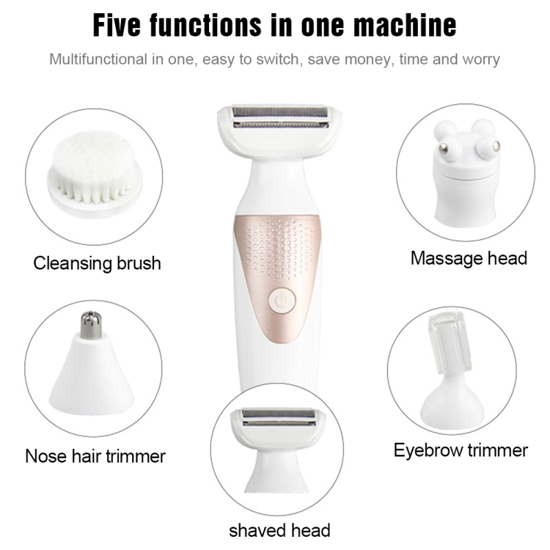 Product accessories: host + shaving head + eyebrow trimmer + nose hair trimming head + cleansing brush + massage head + base + charging cable + cleaning brush