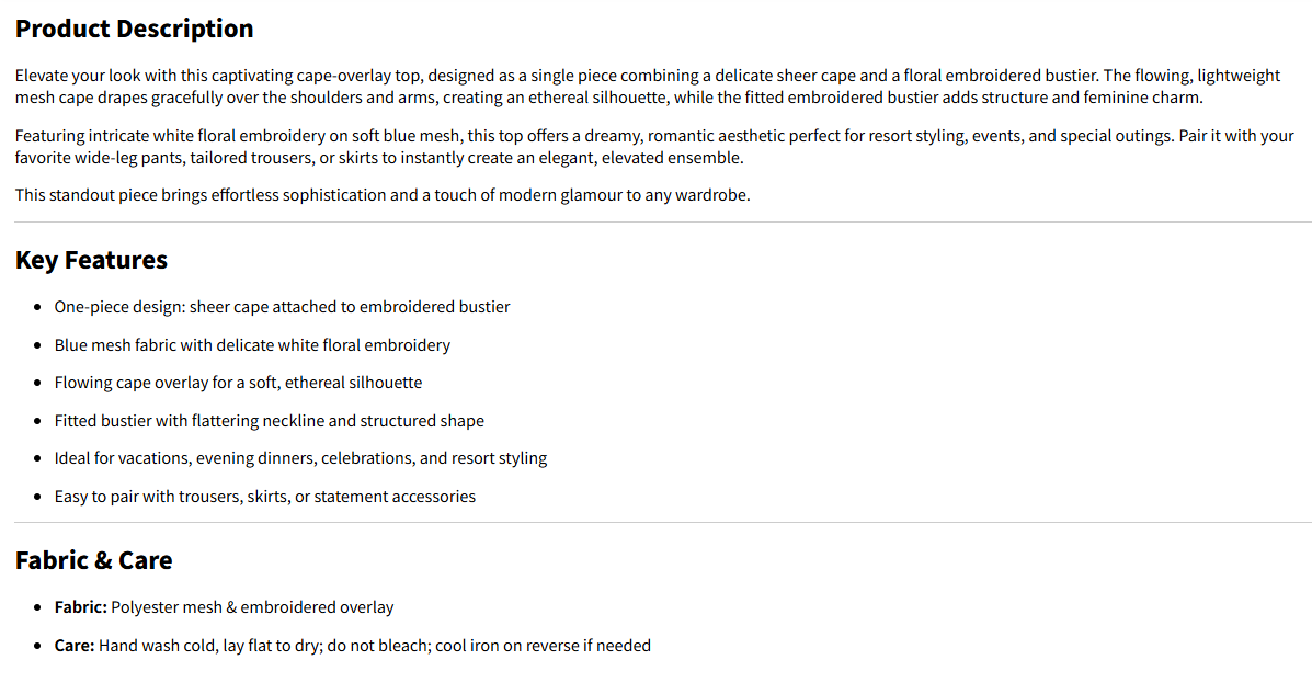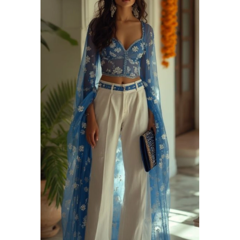 Sheer Embroidered Cape-Overlay Top With Floral Bustier-Blue Statement Blouse
