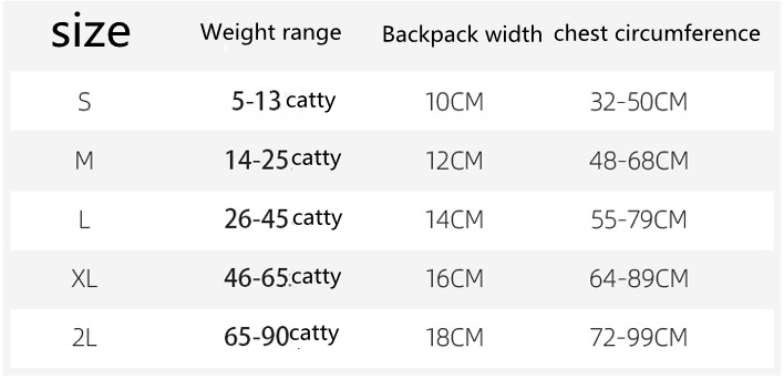Size: S (5-13 kg) M (14-25 kg) L (26-45 kg) XL (46-70 kg) 2XL (71-90 kg)