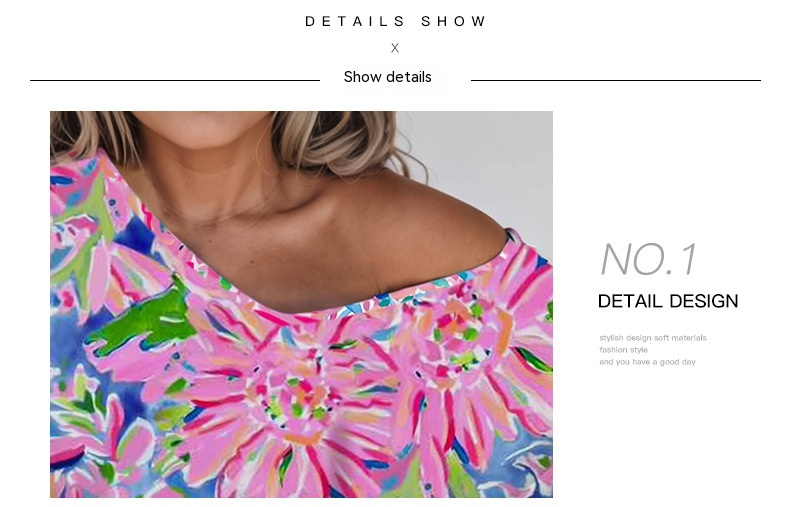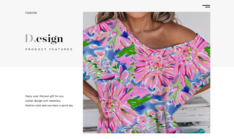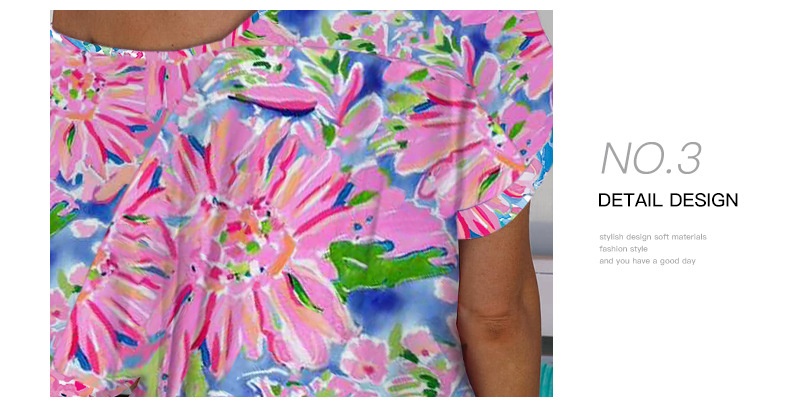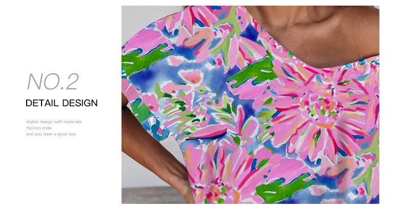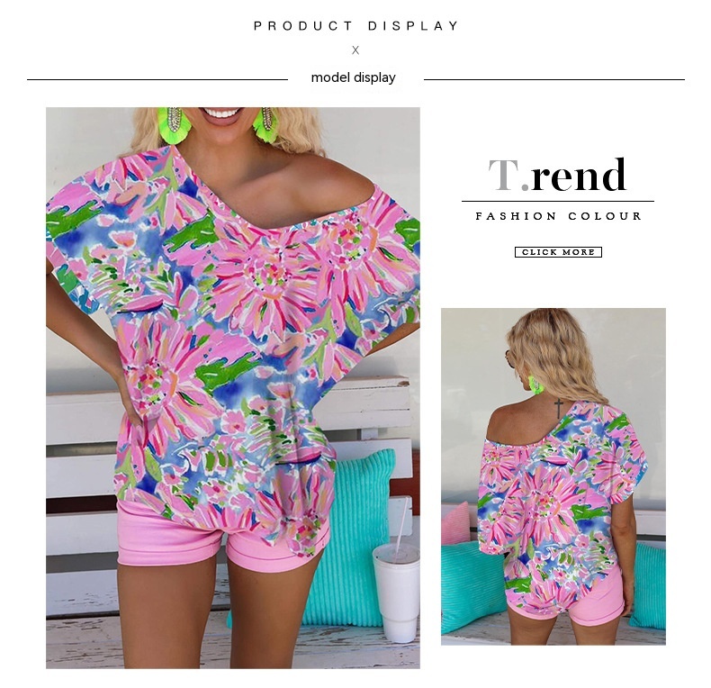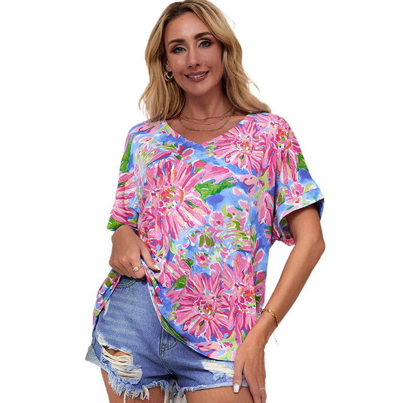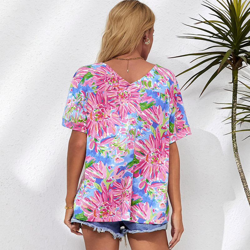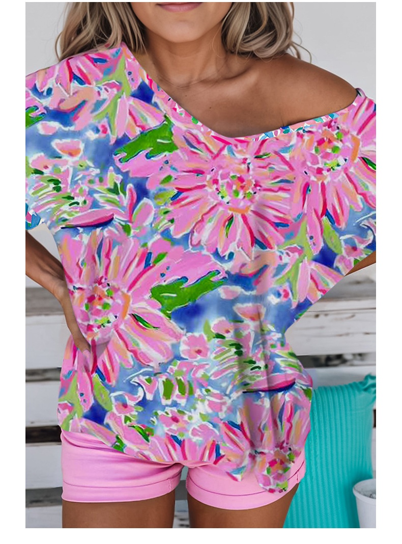 Popular elements: V-neck drop shoulder short sleeve printed loose T-shirt