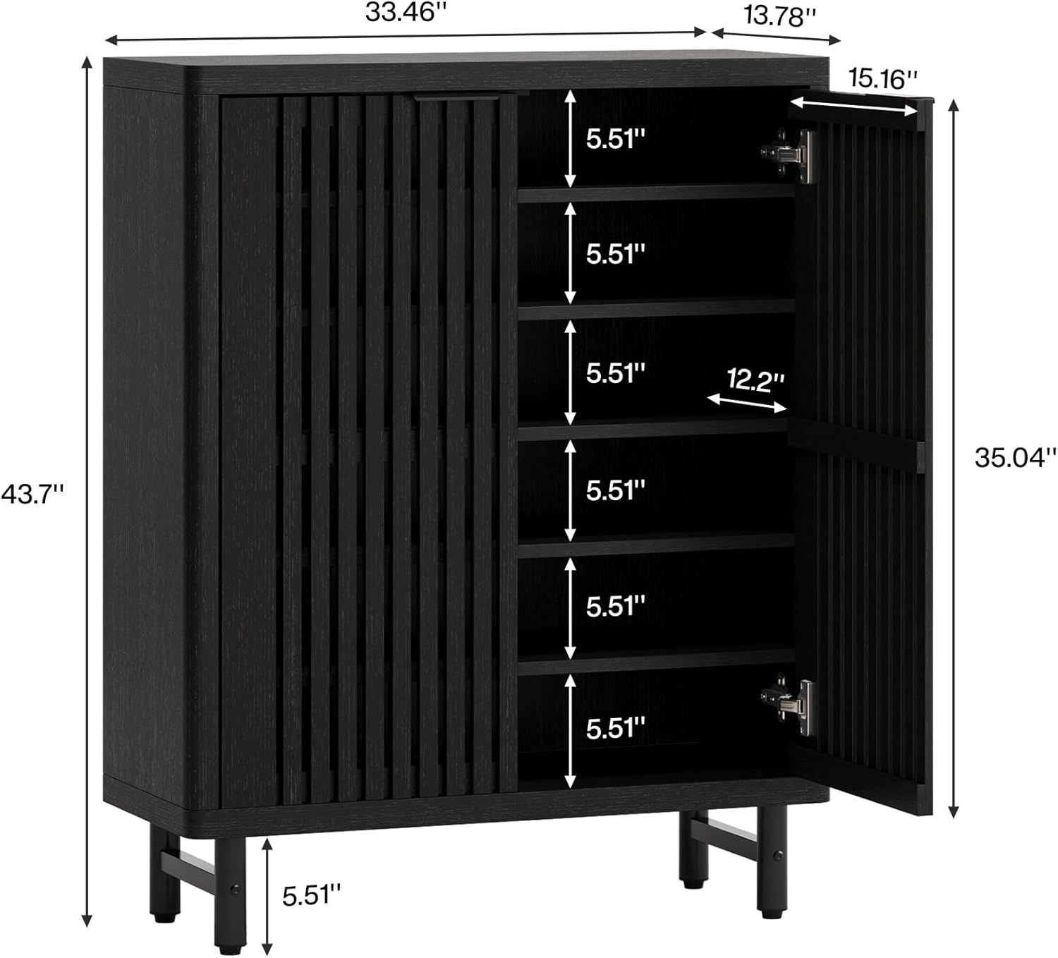 [Spacious Storage Solution]Measuring 33.46" W x 13.78" D x 43.31" H, this shoe cabinet offers generous storage. The wide countertop accommodates keys, bags, and daily essentials, while the open lower shelf suits house shoes and robot vacuums. Inside, six tiers with adjustable partitions maximize space efficiency for versatile storage