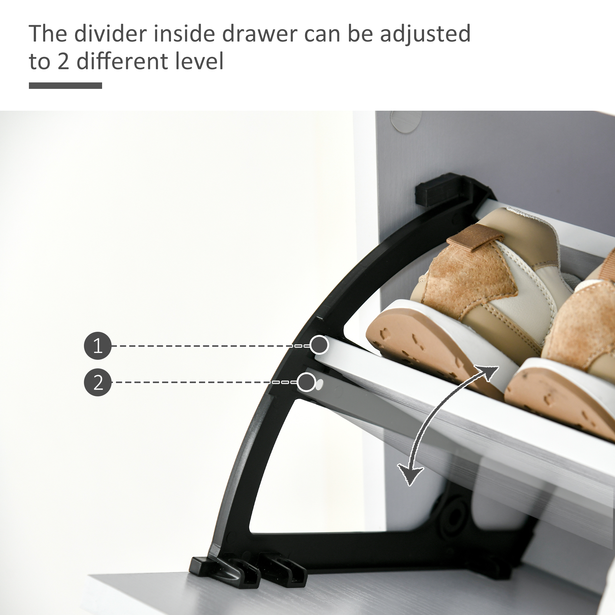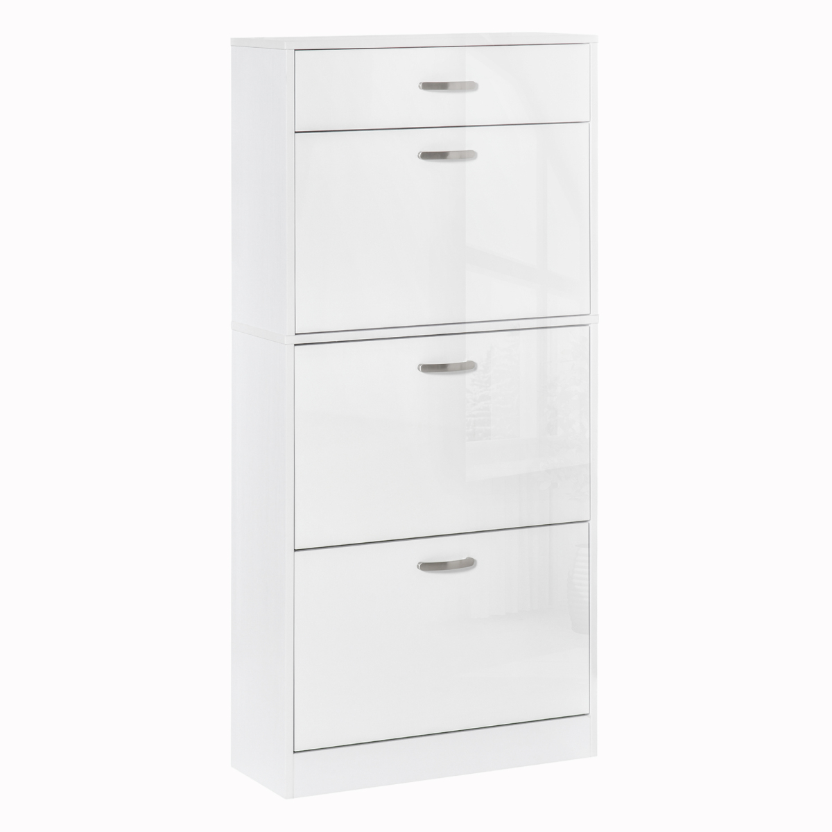 Choose this shoes cabinet from will keep your home tidy. There are three flip drawers, each can hold six pairs - perfect for use with the family or your flatmates. The inner shelf can be set to two different positions for storage which fits your shoes better. Finished with a handy top drawer, offering even more storage. The high gloss shoe storage unit in modern style is a great addition to your home.