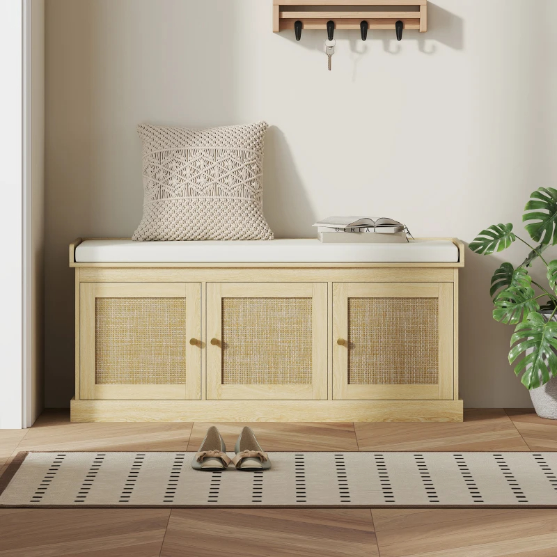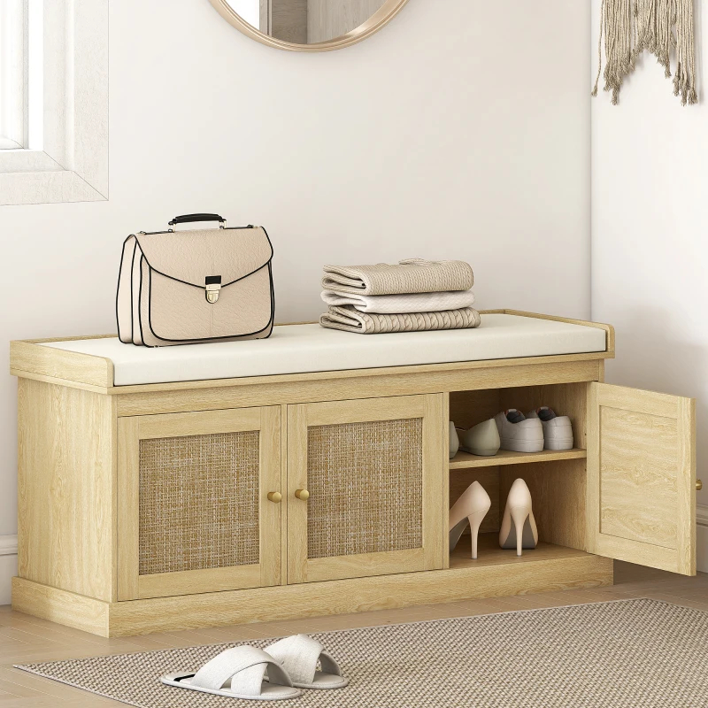 Shoe Storage Bench With Woven Rattan Doors, Shoe Bench With Cushion, Adjustable Shelves, Entryway Bench, Oak Tone