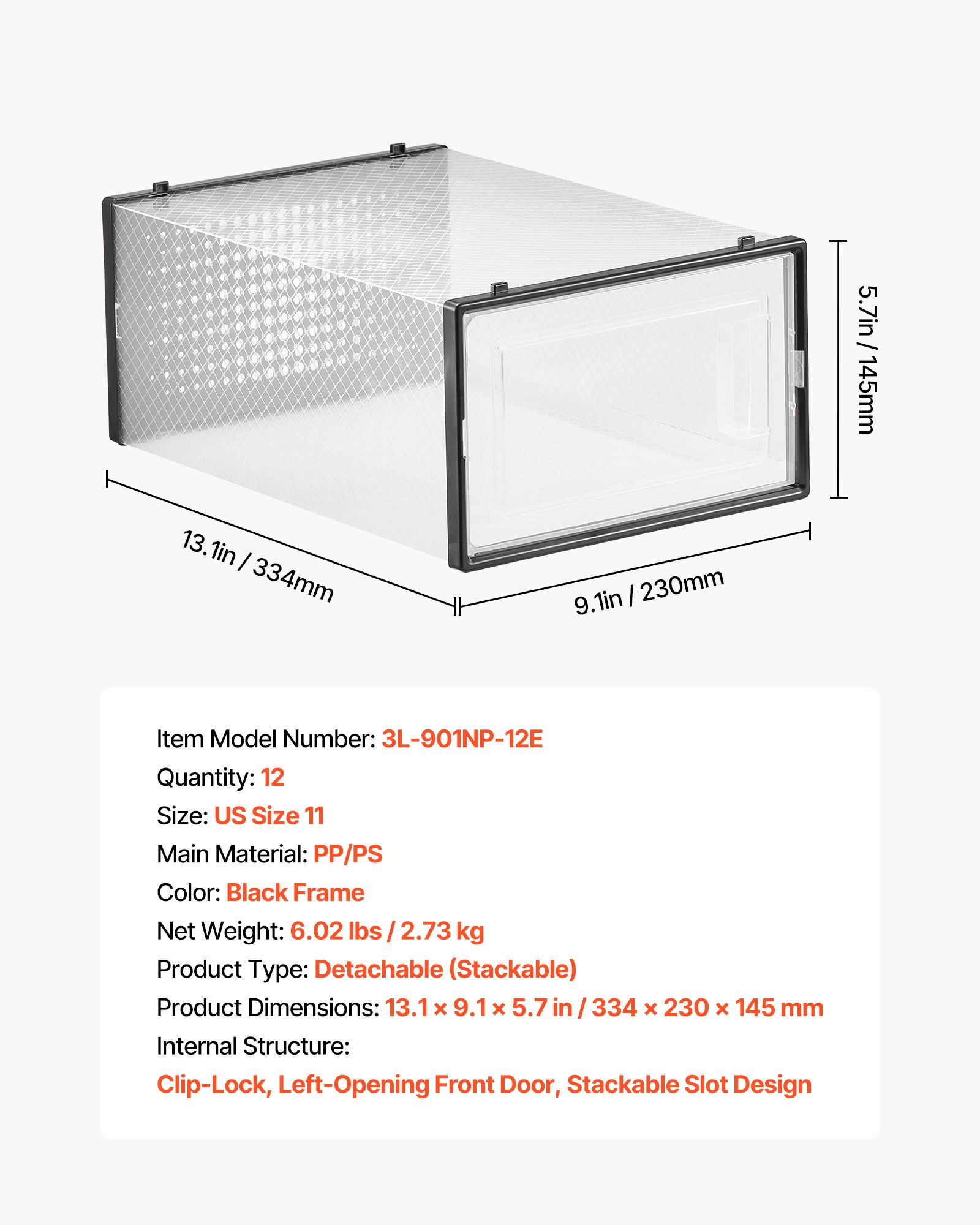 Sturdy Thickened Construction: Our shoe storage boxes are made of upgraded PP/PS on all six sides, providing superior strength for stacking multiple boxes without warping or cracking. The clip-lock front door design makes it easy to access your shoes Stackable Design: Top and bottom non-slip features allow for stable stacking, making clear shoe boxes easy to organize in any corner of your home. The reinforced material supports more boxes, helping you store more shoes and keep your space tidy Spacious and Versatile: Generous size (13.1 x 9.1 x 5.7 in) fits a wide range of shoe types and sizes. Our stackable shoe boxes are also ideal for hats, clothing, small items, toys, and more. The clear design allows you to quickly find what you need Breathable Ventilation: Rear ventilation holes of the shoe organizer boxes keep air circulating, ensuring a dry environment inside the box. This design avoids smell buildup, keeping your shoes fresh Quick, Tool-Free Assembly: No complicated setup – just 3 easy steps to assemble. The plastic shoe organizer fits up to US Size 11 shoes. The transparent body and front door make it simple to spot your shoes, keeping your space neat and organized
