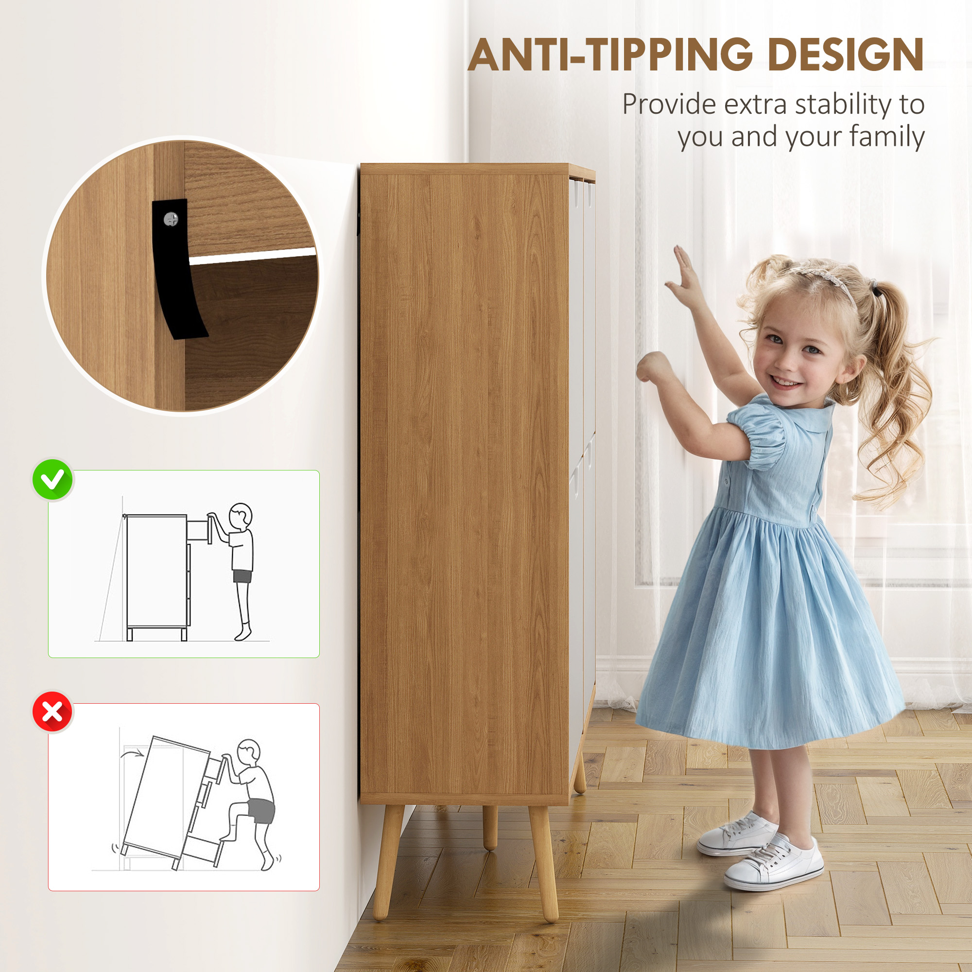 Make it modern with this shoe storage cabinet. A wood-effect frame and white door panels create a Scandi design, which is modern and fresh - as well as extremely versatile. Formed of four flip drawers, making it easy to access: each section holds four shoes up to a UK size 9.5; this shoe storage unit is ideal for shared household use. Comes with anti-tipping straps to attach to a wall; it won't fall forwards.