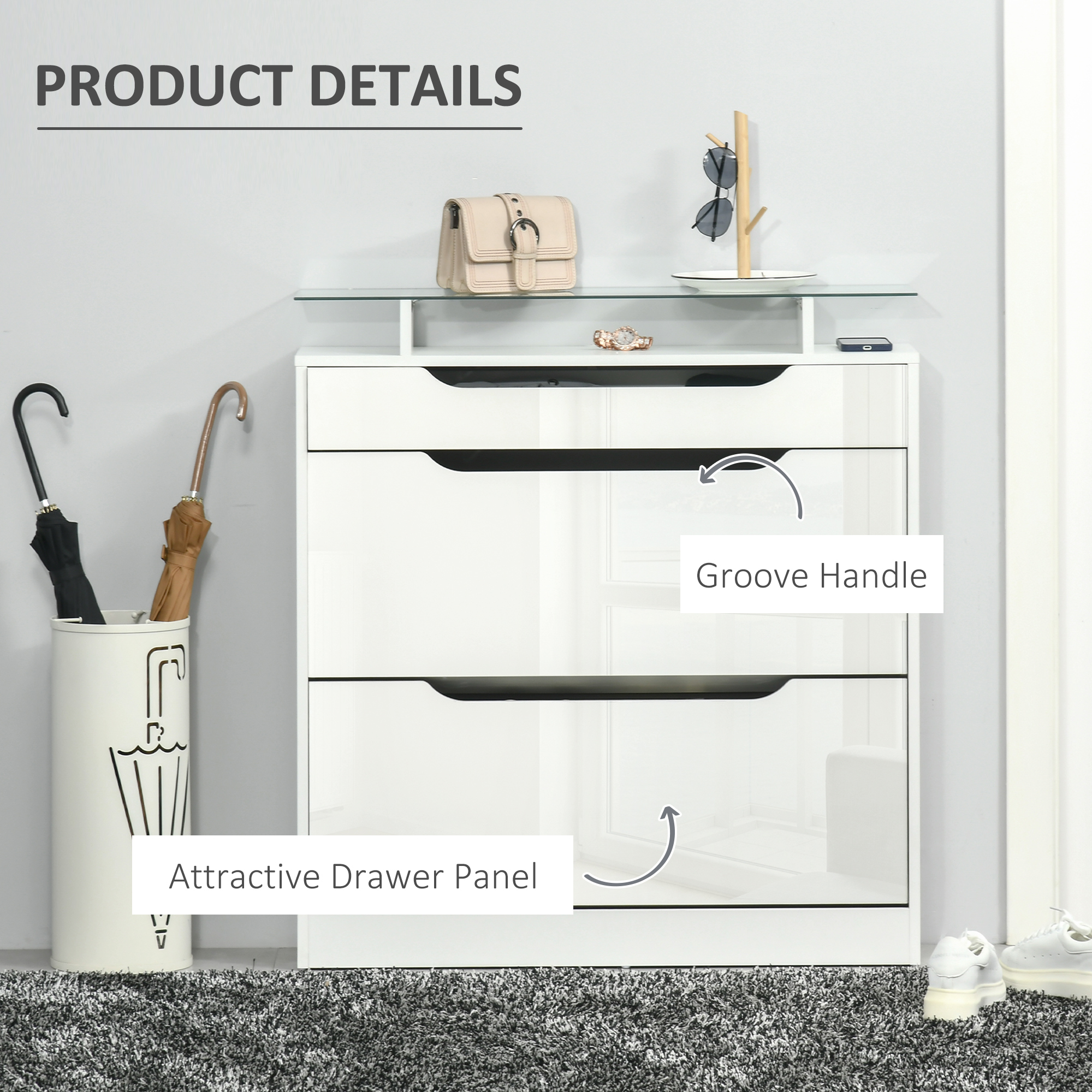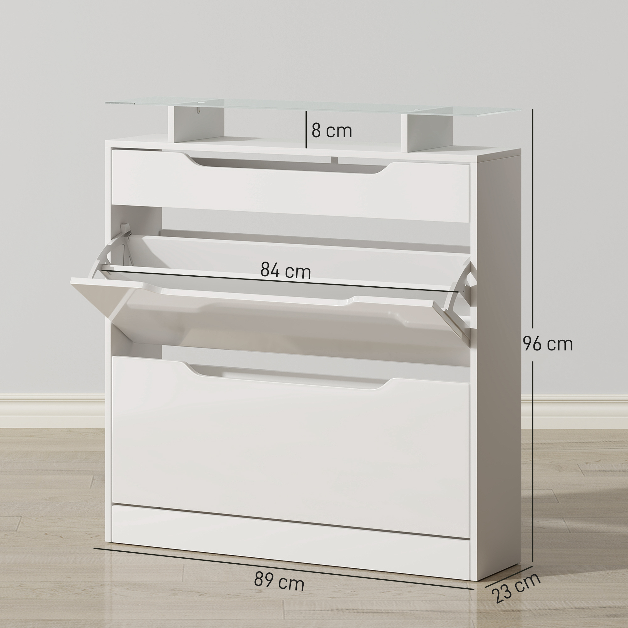 Shoe Storage Cabinet With Slide Out Drawer, 2 Flip Doors, Tempered Glass Top - White