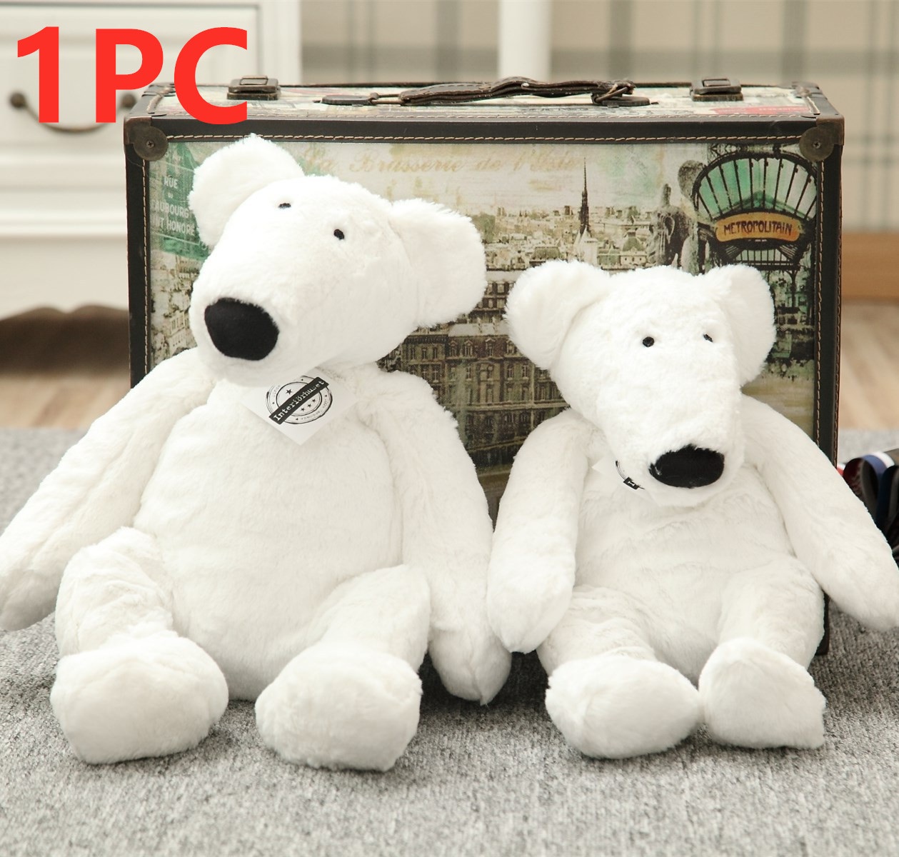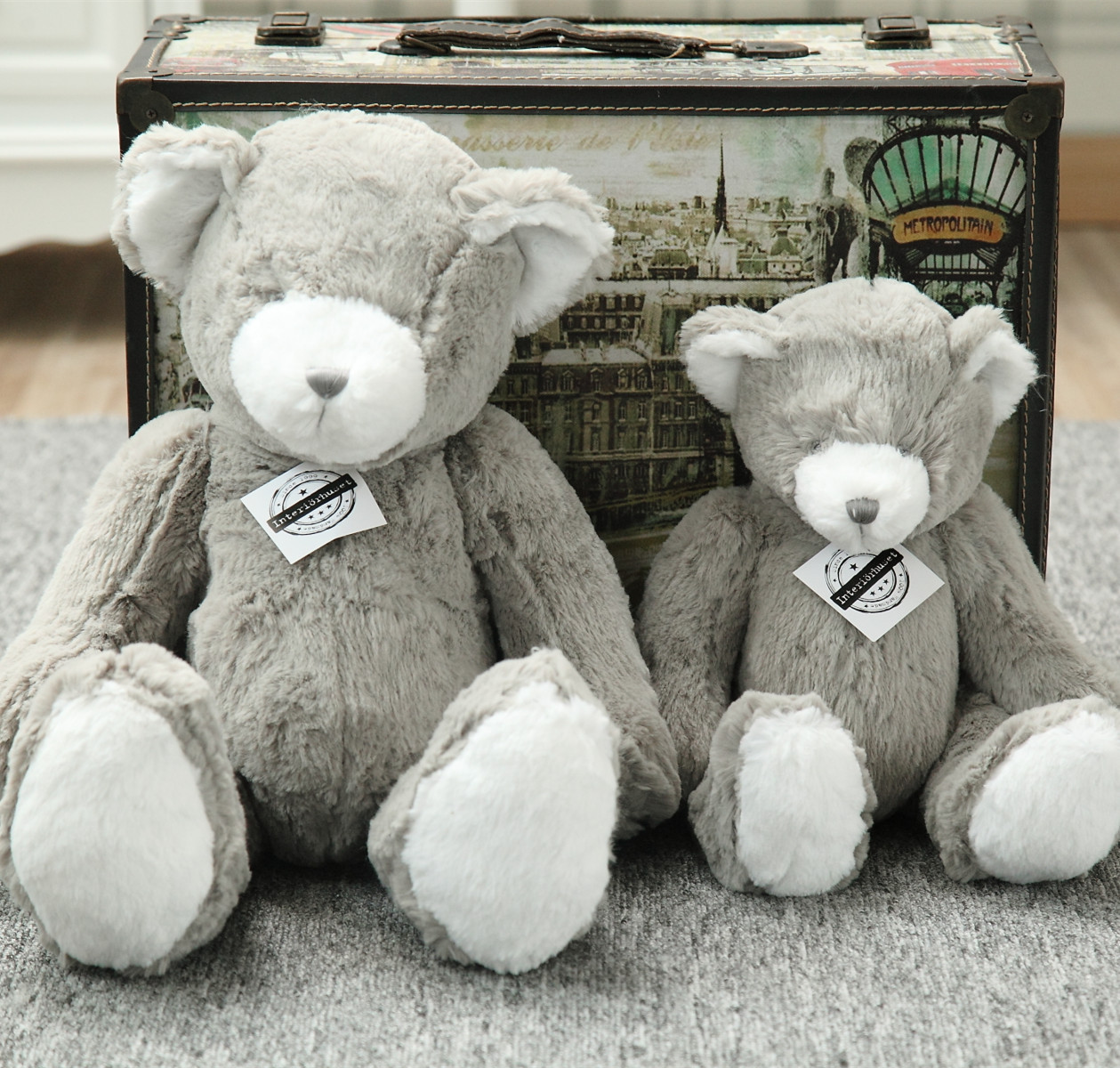 Height: 17cm little rabbit, 23cm big rabbit, 25cm little polar bear, 31cm big polar bear, 32cm little grizzly bear, 45cm big grizzly bear, 17cm little duck, 25cm big duck