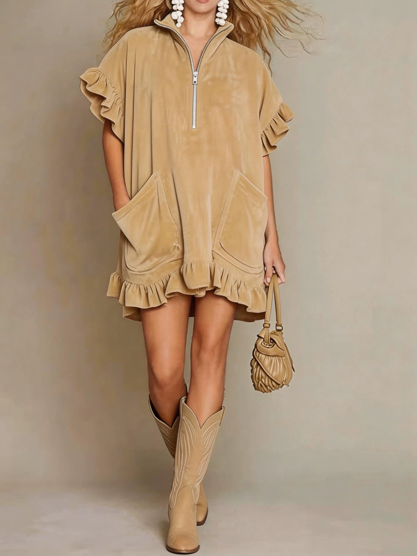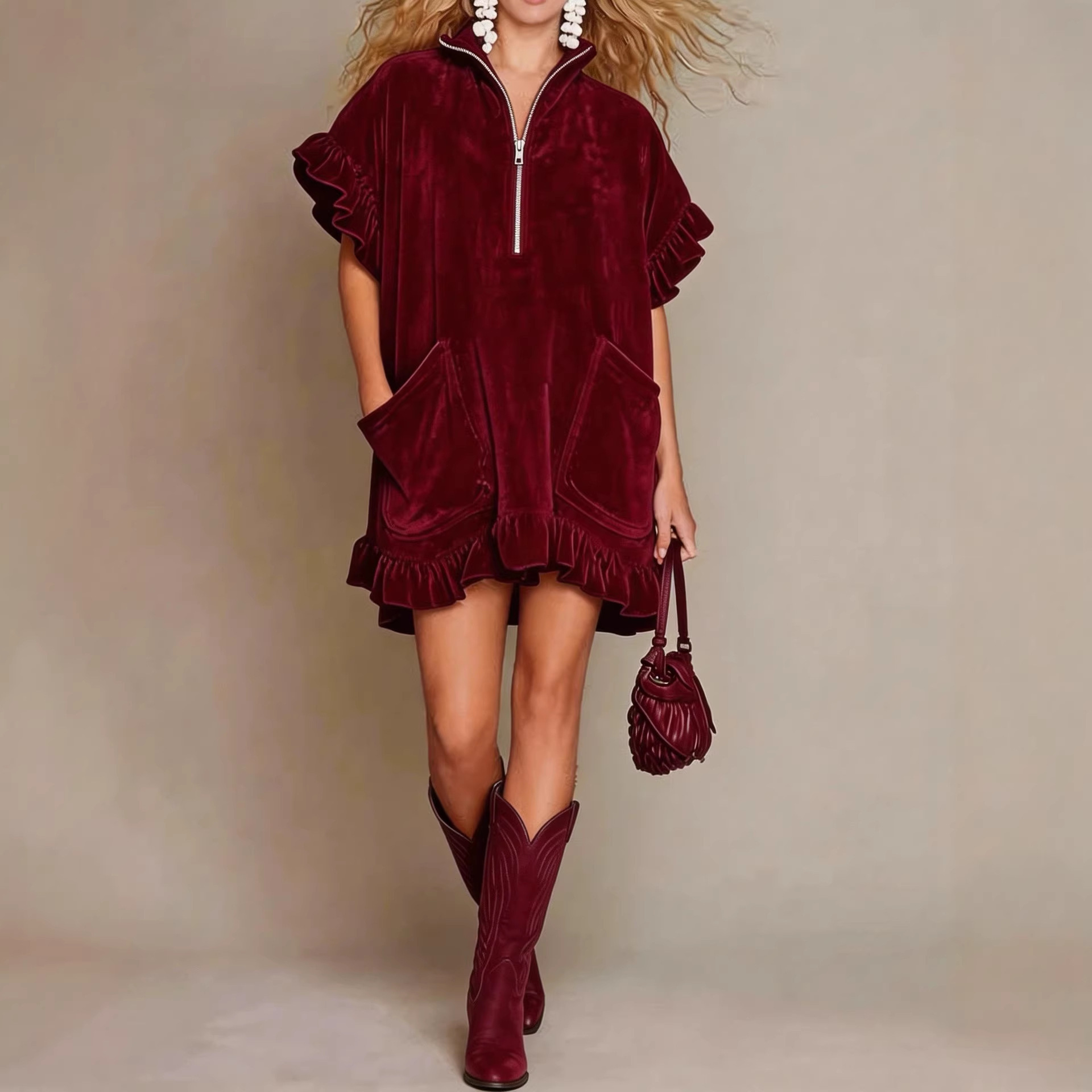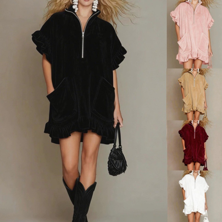 Short-sleeve Double-pocket Dress With Zipper And Ruffled Hem, A-line Womens Outfit