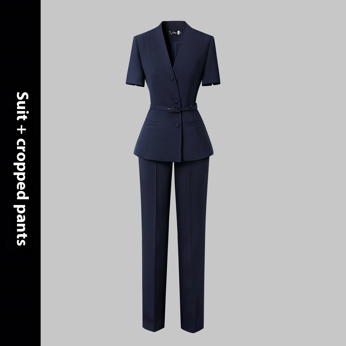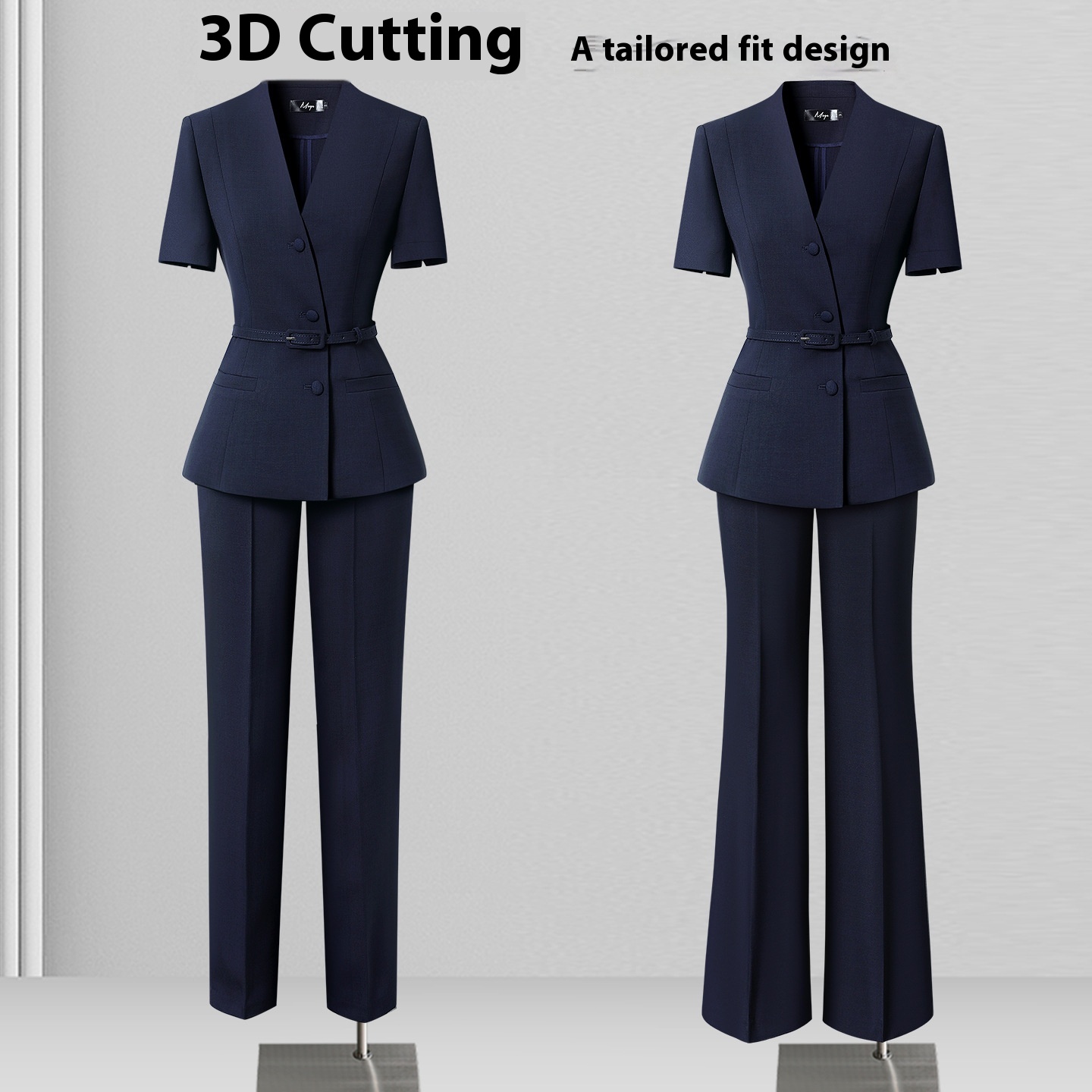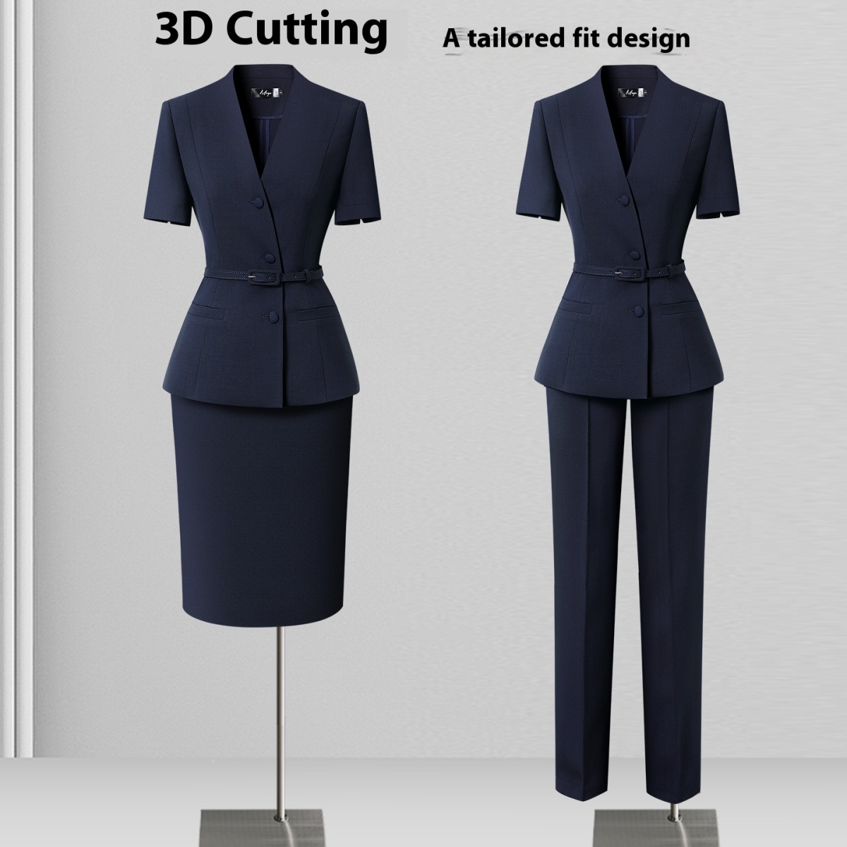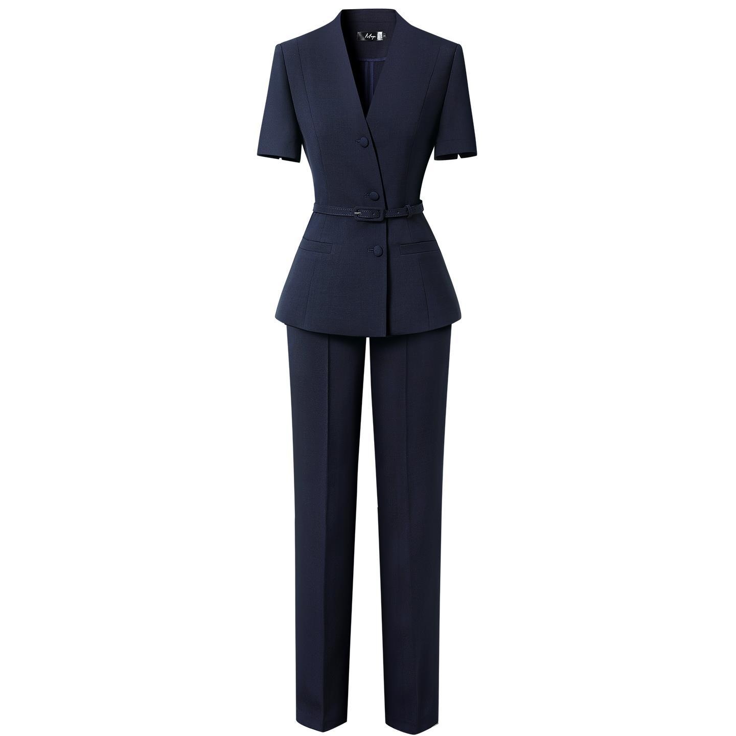 Color: dark blue short sleeve suit, dark blue (suit skirt), dark blue (suit skirt), dark blue (suit pants wide leg pants), dark blue (suit skirt wide leg pants), dark blue (suit skirt ankle-length pants)