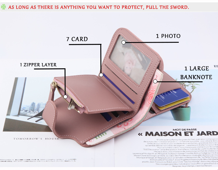 The internal structure of the packet: key slot, photo slot, zipper compartment, bill holder, card slot, change slot, certificate slot, check slot