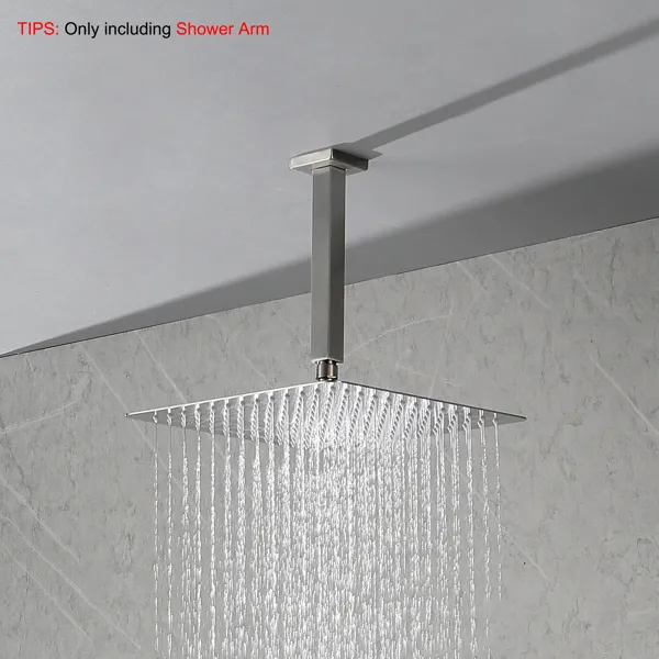 The shower arm features an elegant and minimalist, adding aesthetic appeal to your bathroom and creating a modern vibe. The shower arm is made of 304 stainless steel, featuring rust and corrosion resistance as well as exceptional sturdiness and durability. The shower arm features standard U.S. 1/2 NPT tapered threads and is compatible with most universal rain shower heads. Easy Installation: Ceiling Mounted. The shower head extension arm can be installed with a simple twist – no tools needed, no plumber required, and the whole process takes just minutes.