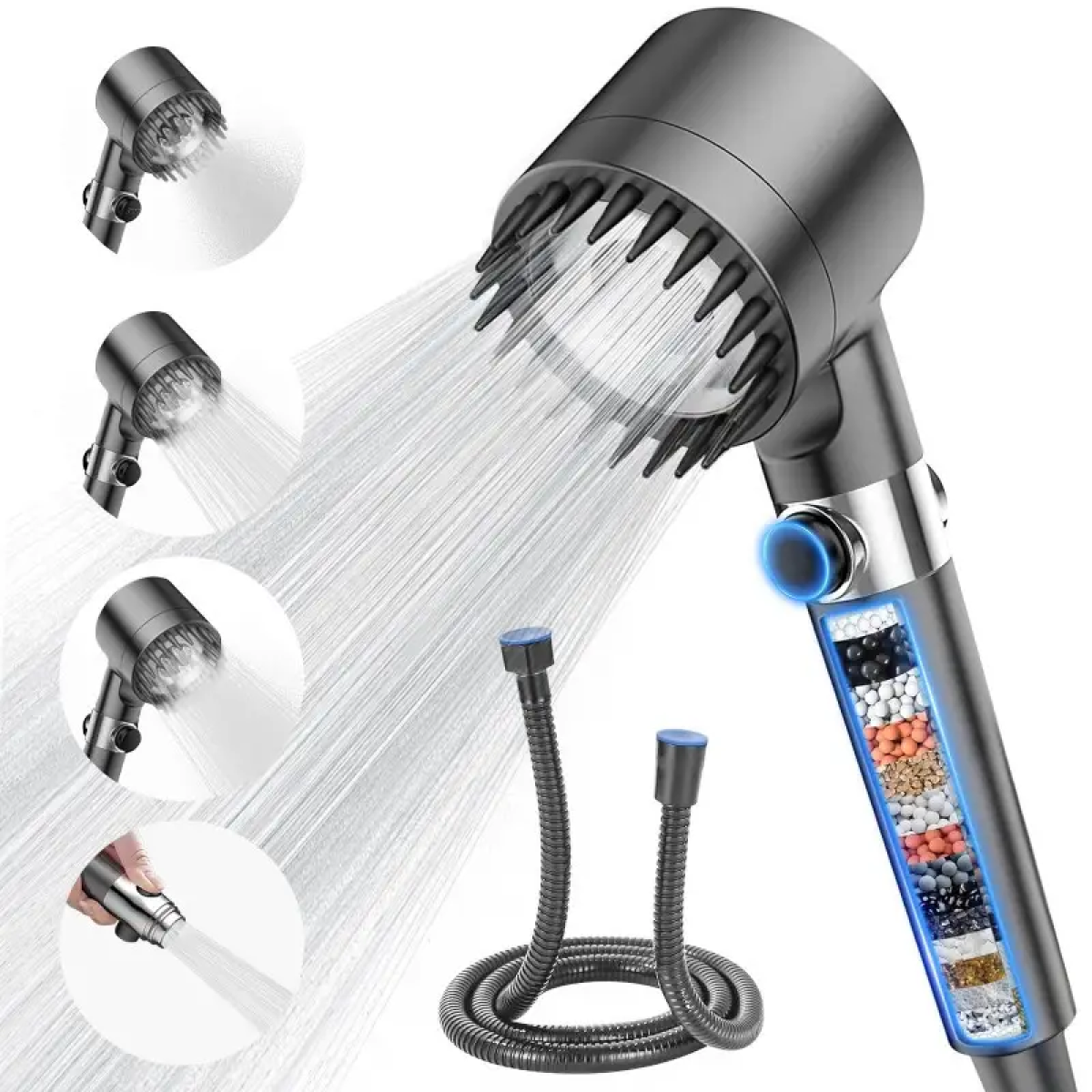 【Filter Shower】This shower features a built-in advanced nano-cotton filter that effectively removes rust, impurities, and sediment from water, purifying the water quality. It helps maintain the natural moisturizing oils of hair and body while preventing skin and hair damage. Ideal for hard water environments