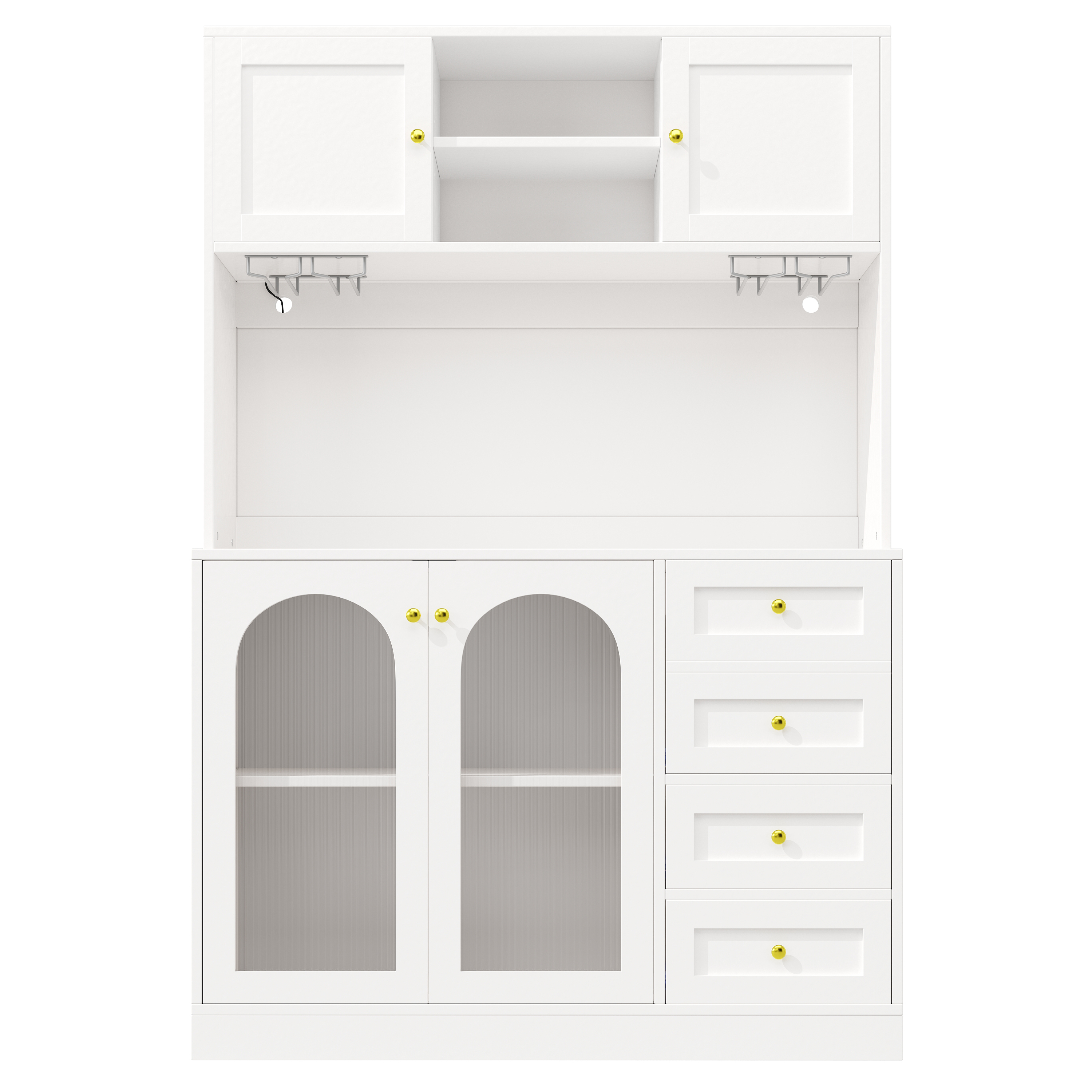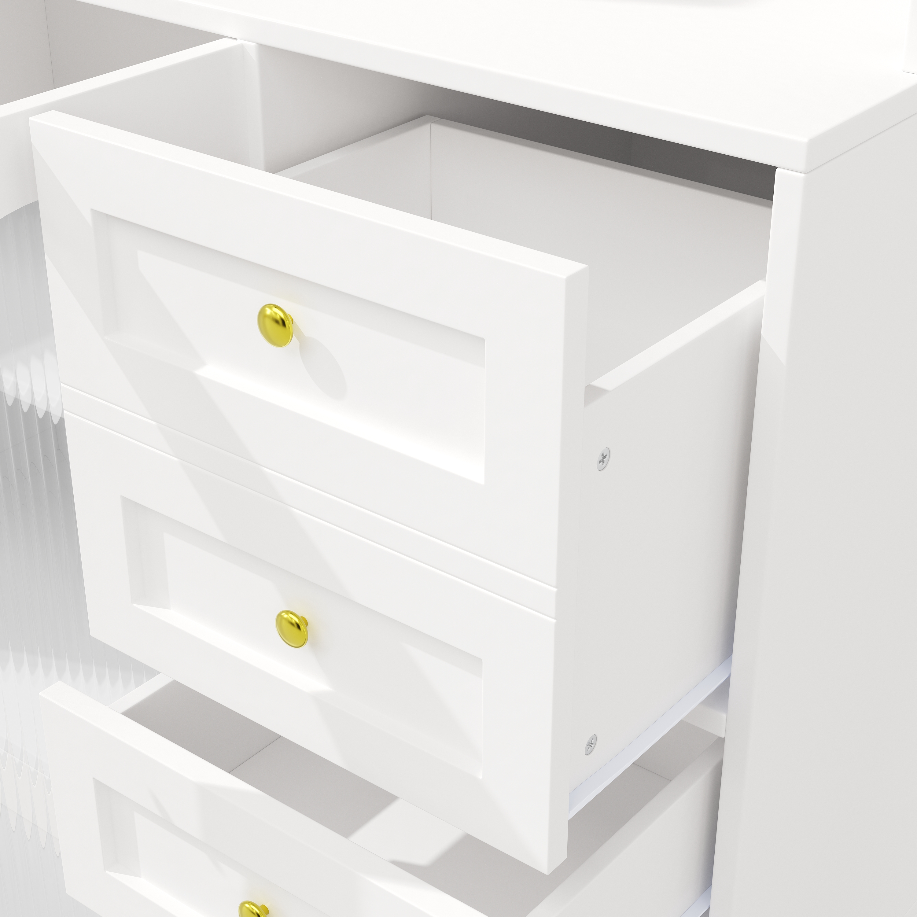The cabinet is available in white, accented with gold handles. The doors are made with fluted glass, which gives the design a retro-minimalist yet striking look. It fits seamlessly into any area of your home.