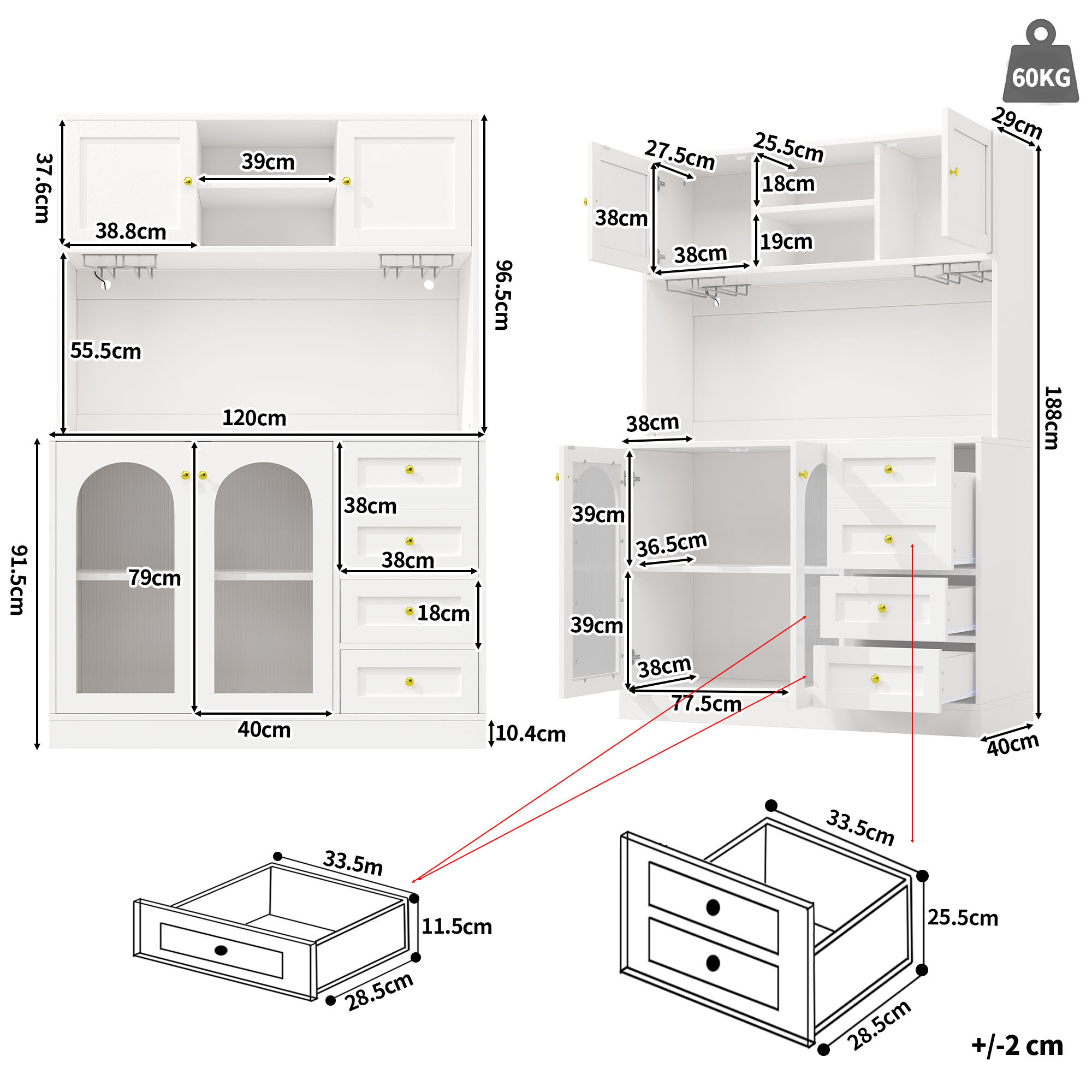 The buffet cabinet is 120 cm long, 40 cm wide and 188 cm high, with a spacious storage space.