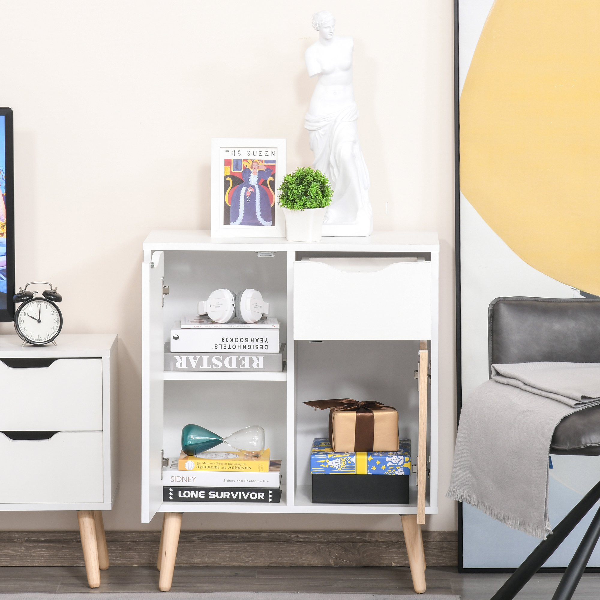 Keep your home stylish and the space tidy: look no further than this freestanding cabinet from . Cut to a clean boxy shape for simplicity, it comes with two cupboards and a top drawer, giving a moderate amount of storage. The white finish is clean, with the coloured door adding a unique point of difference so it stands out gently. Made from particle board, this piece is durable, finished with small wooden legs so it stands steady and back straps so it doesn't topple over.