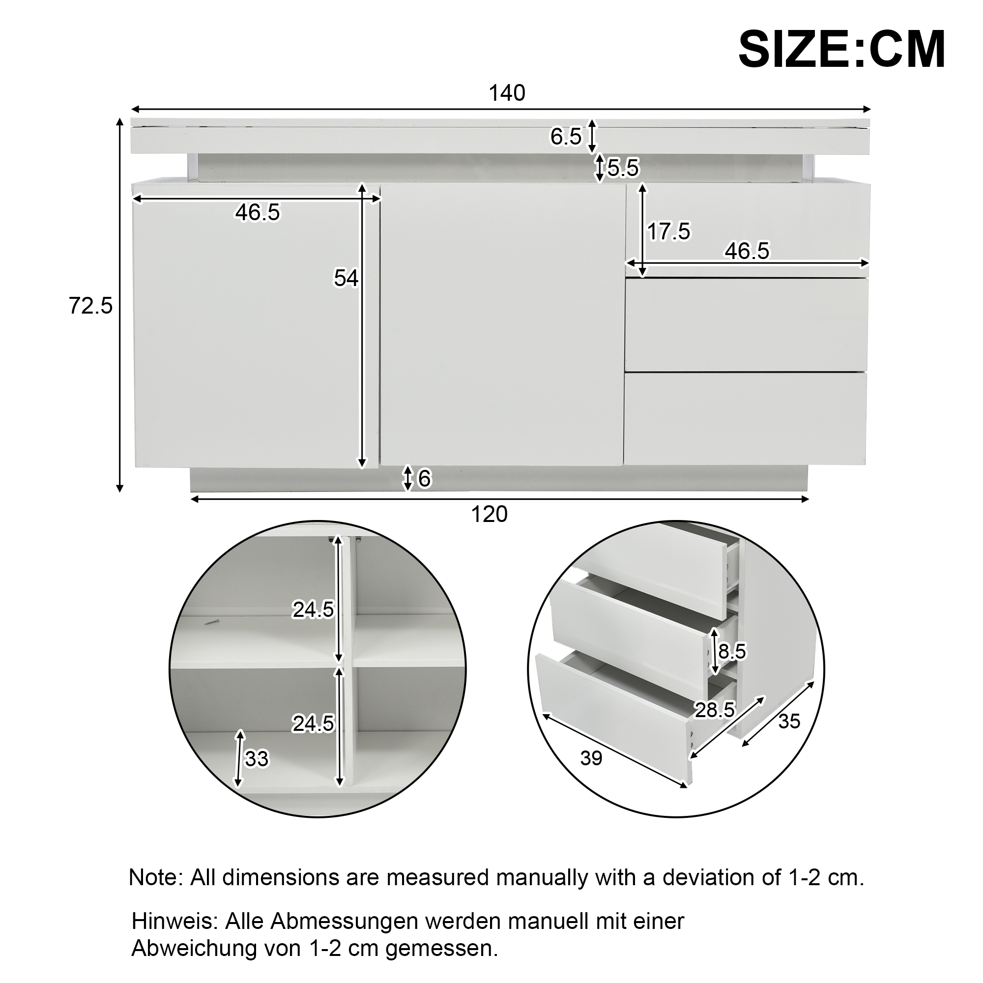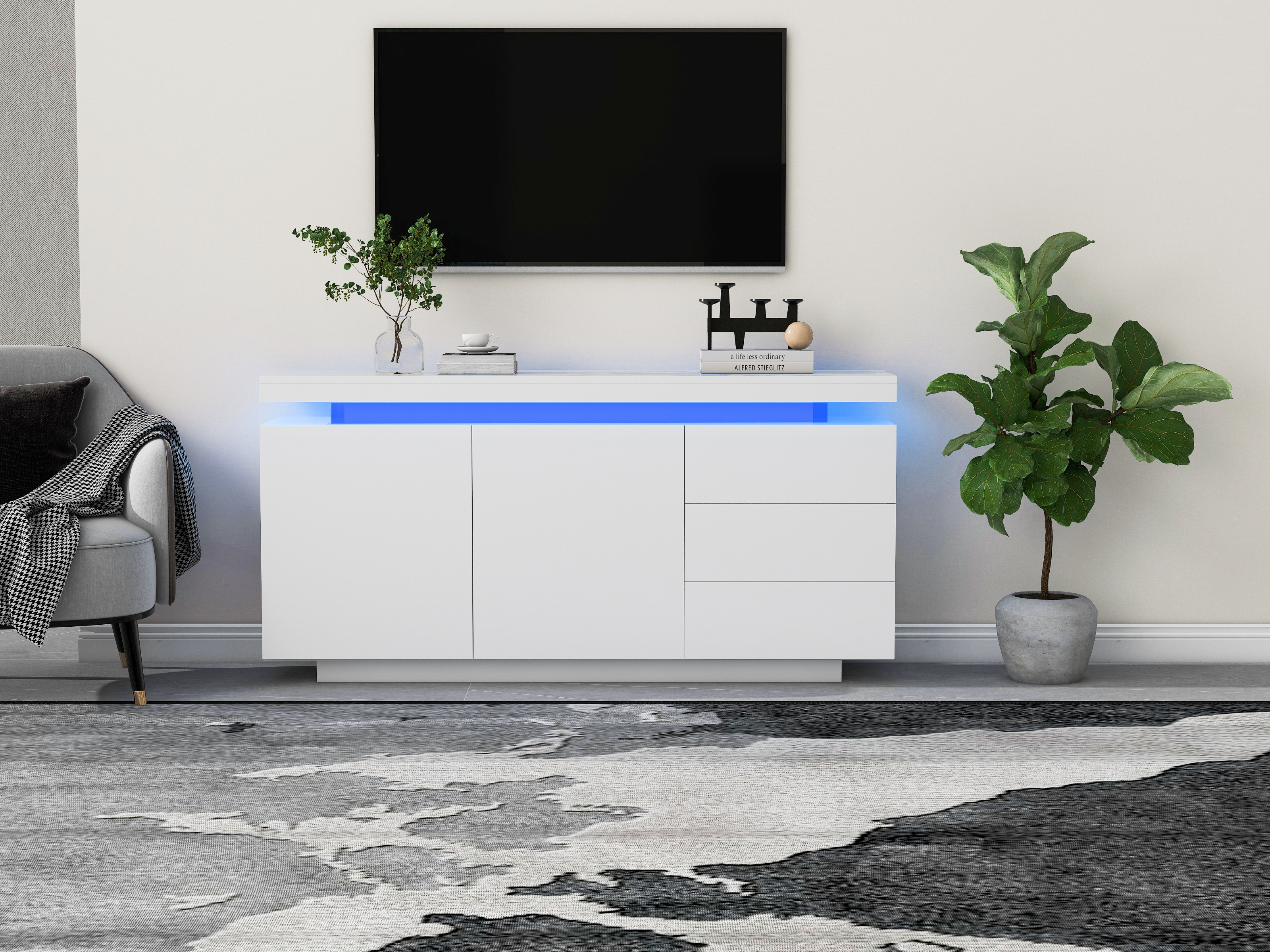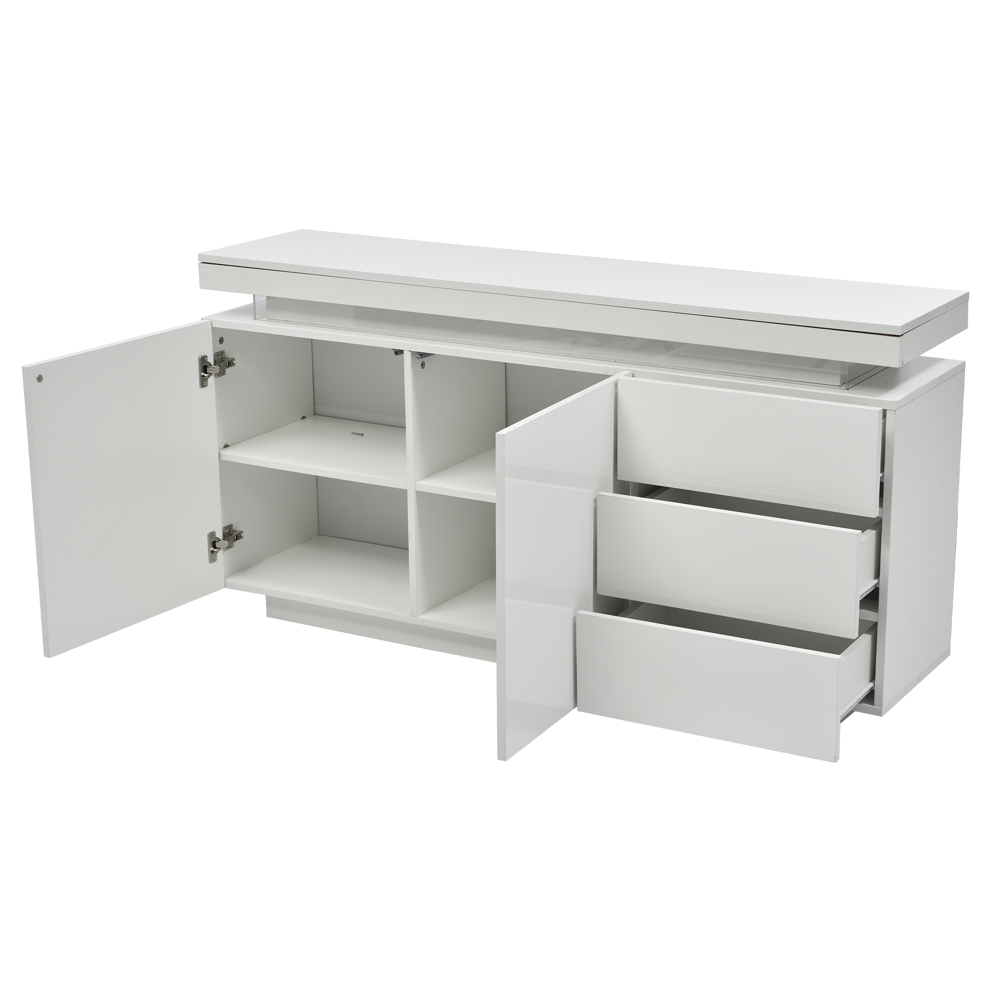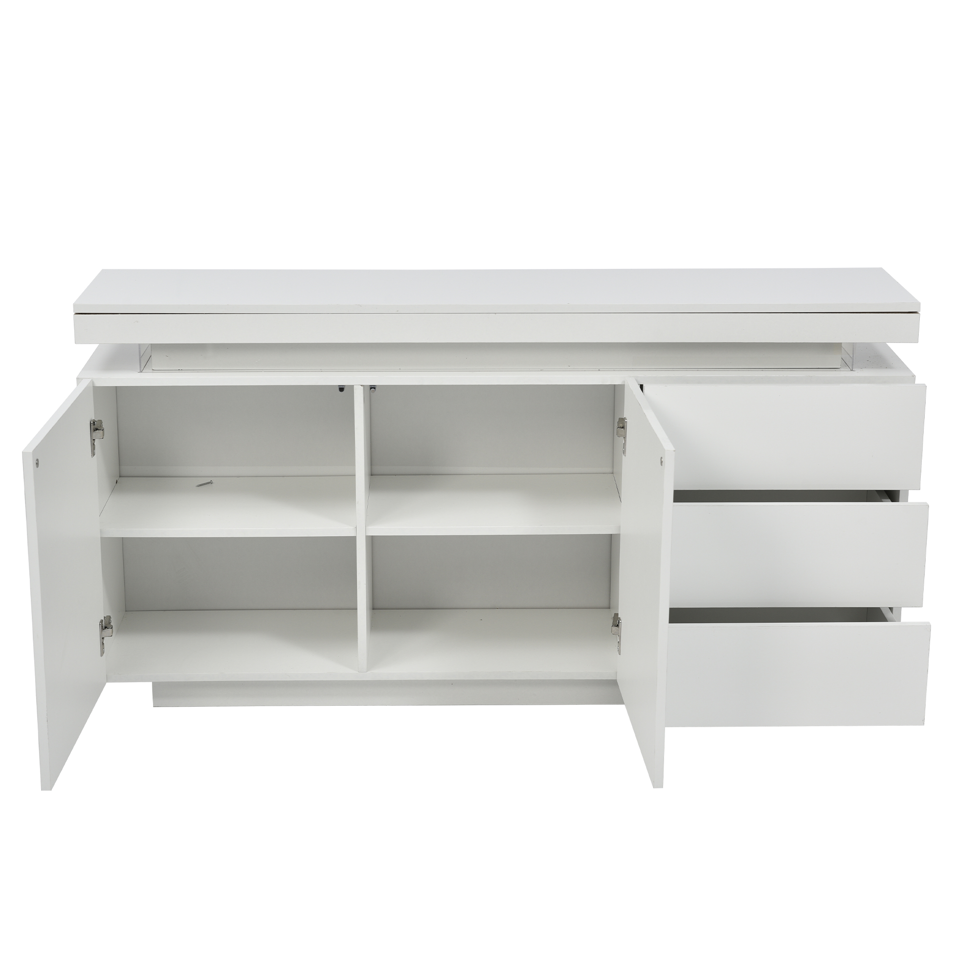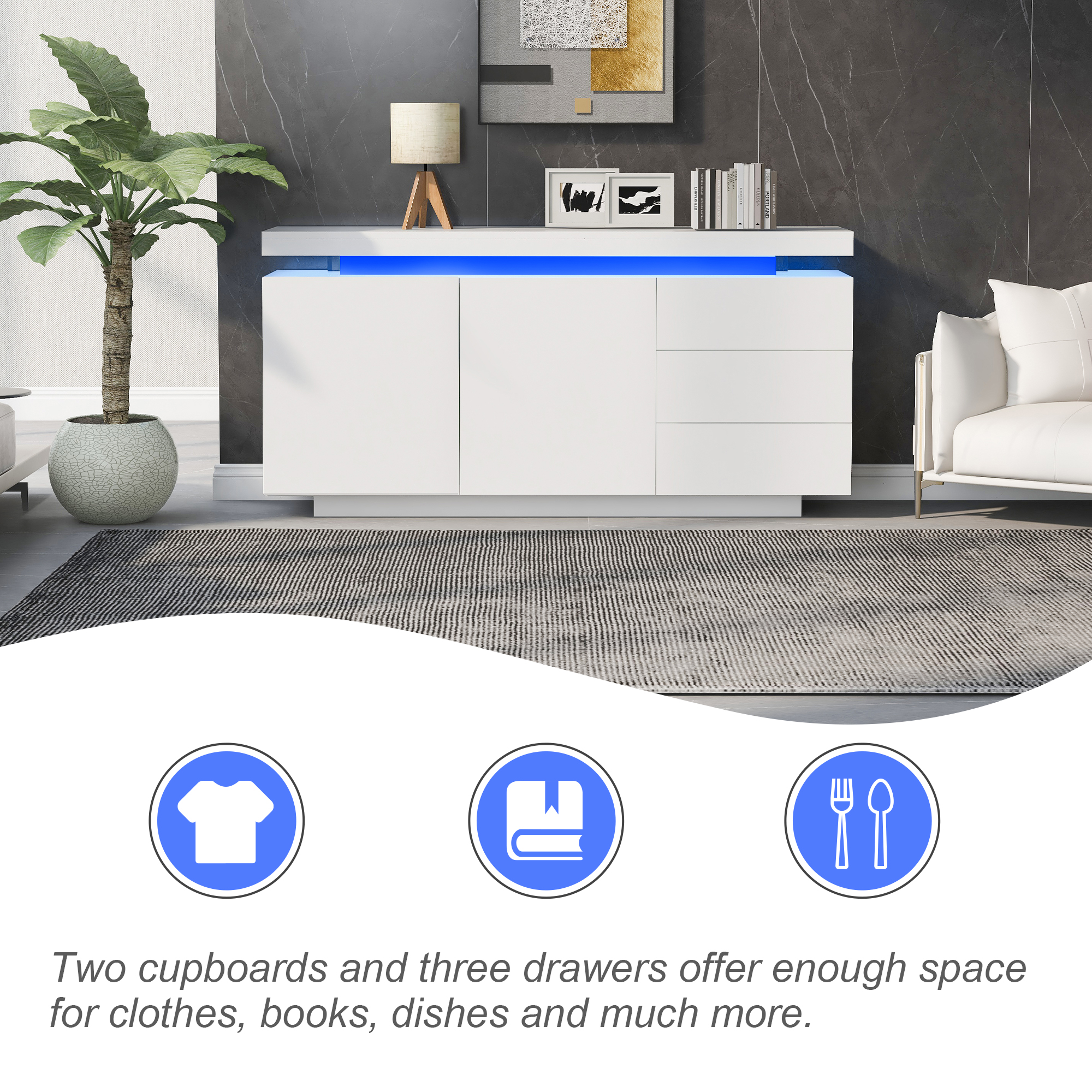 Product Name:Sideboard with LED Lights, Side Cabinet Standing Cabinet Chest of Drawers Highboard Sideboard with 2 Doors & 3 Drawers, High Gloss Sideboard for Living Room Dining Room, White