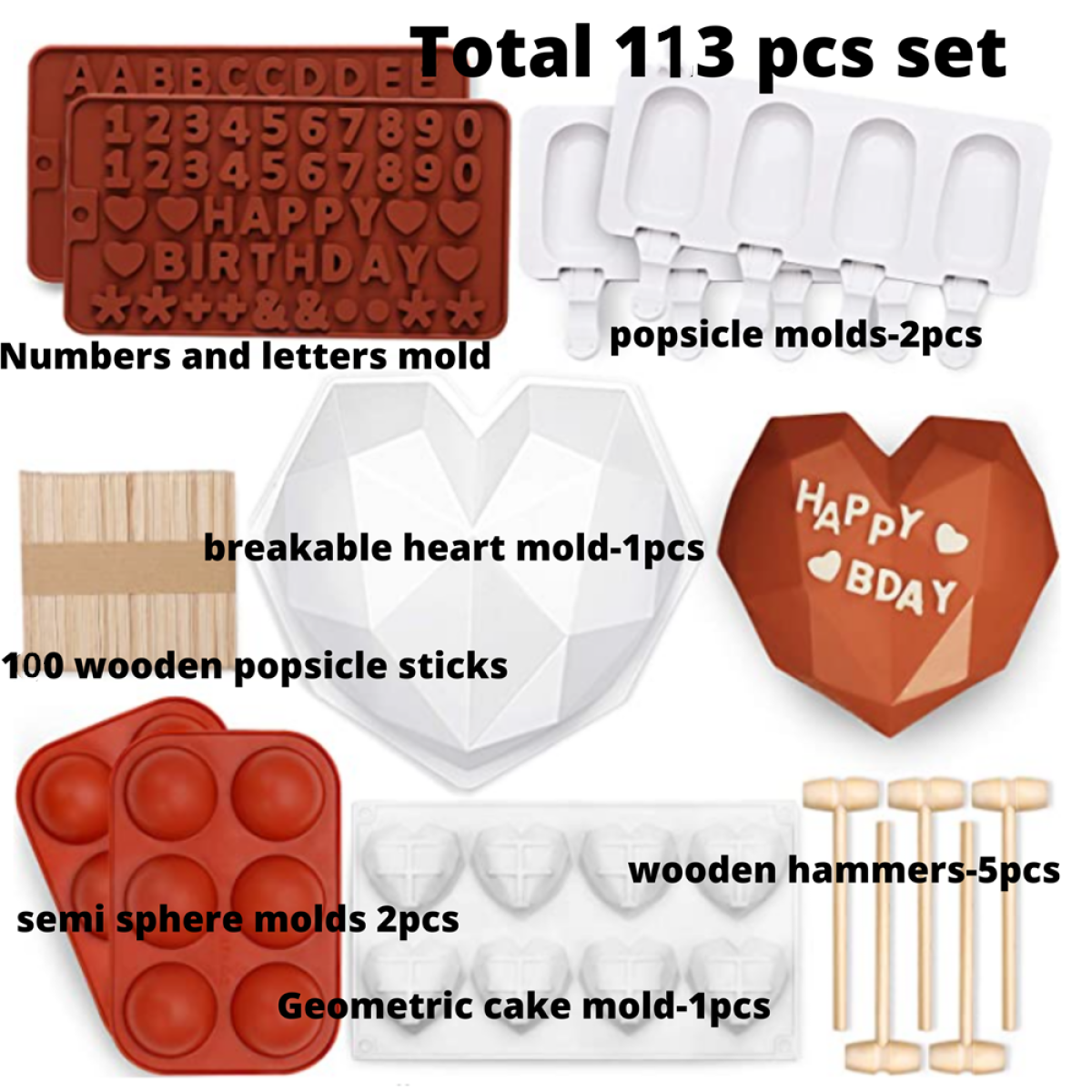1x heart shape; 1x number mold; 1x letter mold; 5x wooden hammer; 100x wooden stick; 2xsemi sphere molds; 2xpopsicle mold; 1xGeometric cake mold.