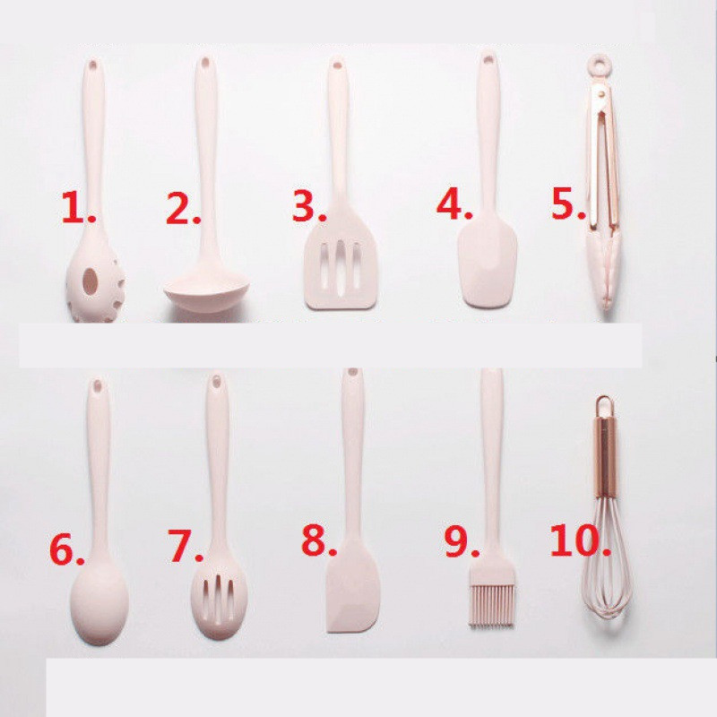 Spatula*1, duck tongue spatula*1, drain spatula*1, rose gold egg whisk*1, rose gold food tongs*1,soup spoon*1, powder claw*1, thick soup spoon*1, leakage spoon*1, brush*1