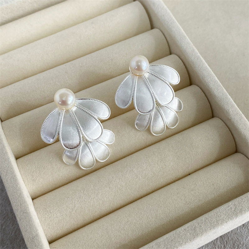 Silver Brushed Pearl Four Pieces Petal Stud Earrings