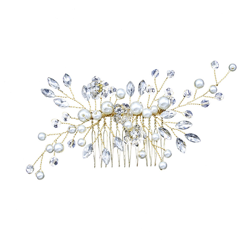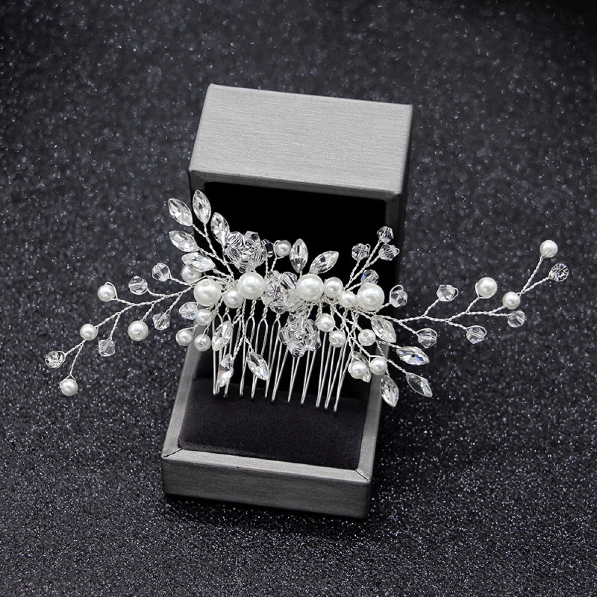 Product information :Material: pearlColor: gold, silverType: hair comb, plug combSize Information:Size: 6*13CMPacking list:Comb *1